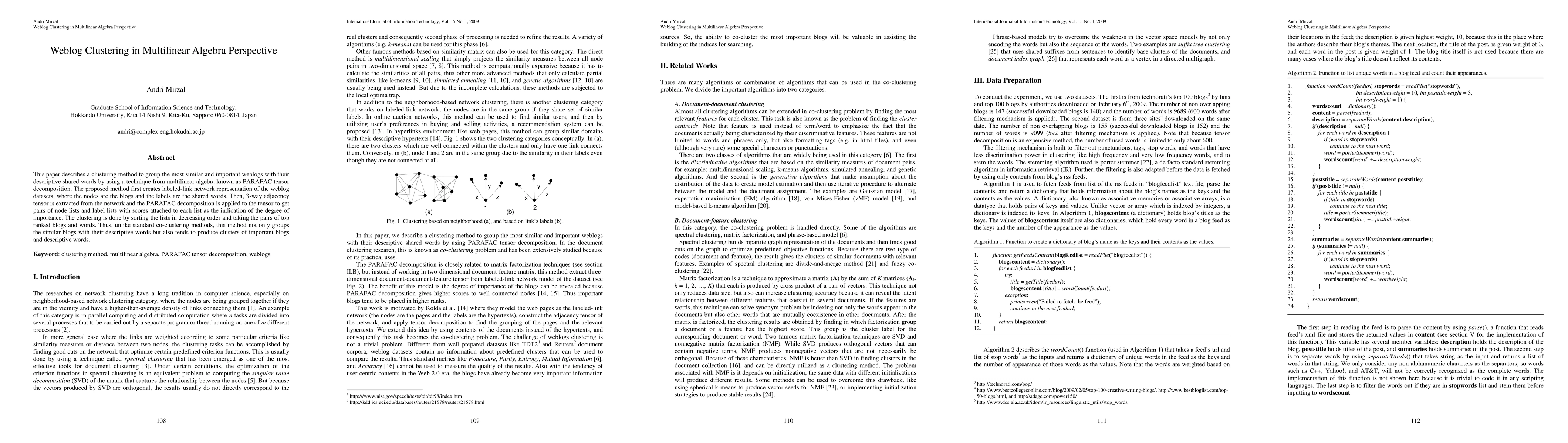 This paper proposes a weblog clustering method using PARAFAC tensor decomposition to group similar blogs by shared descriptive words, creating a labeled-link network and extracting a 3-way adjacency tensor to identify important blog and word pairs. Unlike standard co-clustering, it emphasizes both similarity and importance.