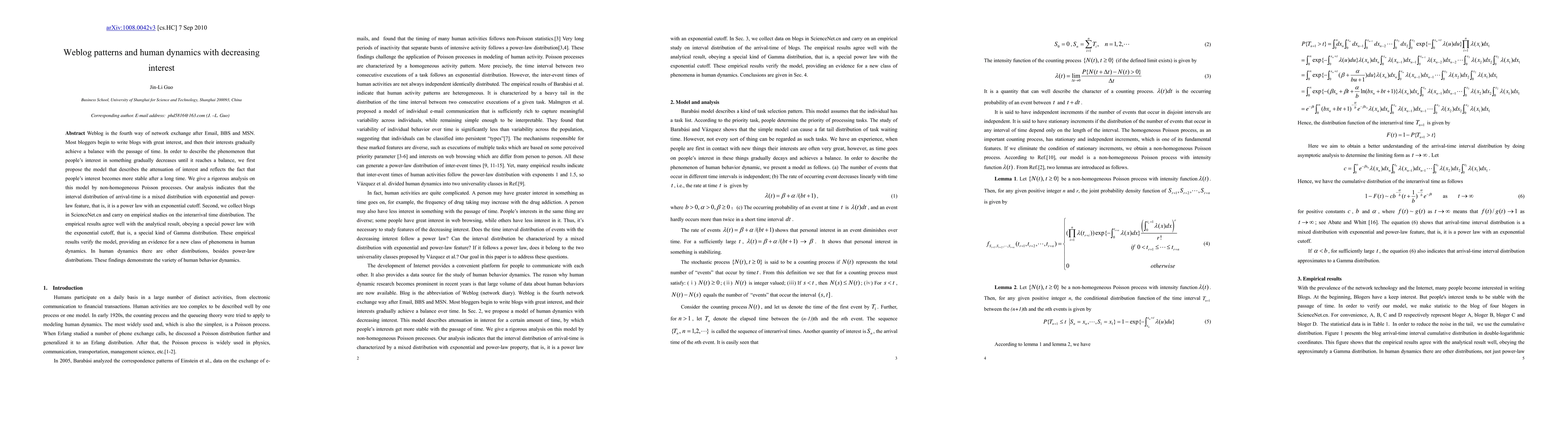 Weblog is the fourth way of network exchange after Email, BBS and MSN. Most bloggers begin to write blogs with great interest, and then their interests gradually achieve a balance with the passage of time. In order to describe the phenomenon that people's interest in something gradually decreases until it reaches a balance, we first propose the model that describes the attenuation of interest and reflects the fact that people's interest becomes more stable after a long time. We give a rigorous analysis on this model by non-homogeneous Poisson processes. Our analysis indicates that the interval distribution of arrival-time is a mixed distribution with exponential and power-law feature, that is, it is a power law with an exponential cutoff. Second, we collect blogs in ScienceNet.cn and carry on empirical studies on the interarrival time distribution. The empirical results agree well with the analytical result, obeying a special power law with the exponential cutoff, that is, a special kind of Gamma distribution. These empirical results verify the model, providing an evidence for a new class of phenomena in human dynamics. In human dynamics there are other distributions, besides power-law distributions. These findings demonstrate the variety of human behavior dynamics.