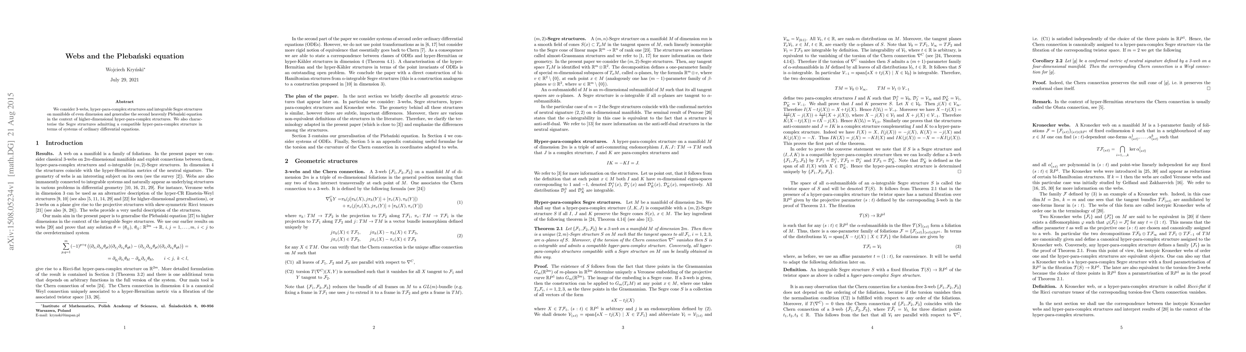 We consider 3-webs, hyper-para-complex structures and integrable Segre structures on manifolds of even dimension and generalise the second heavenly Pleba\'nski equation in the context of higher-dimensional hyper-para-complex structures. We also characterise the Segre structures admitting a compatible hyper-para-complex structure in terms of systems of ordinary differential equations.