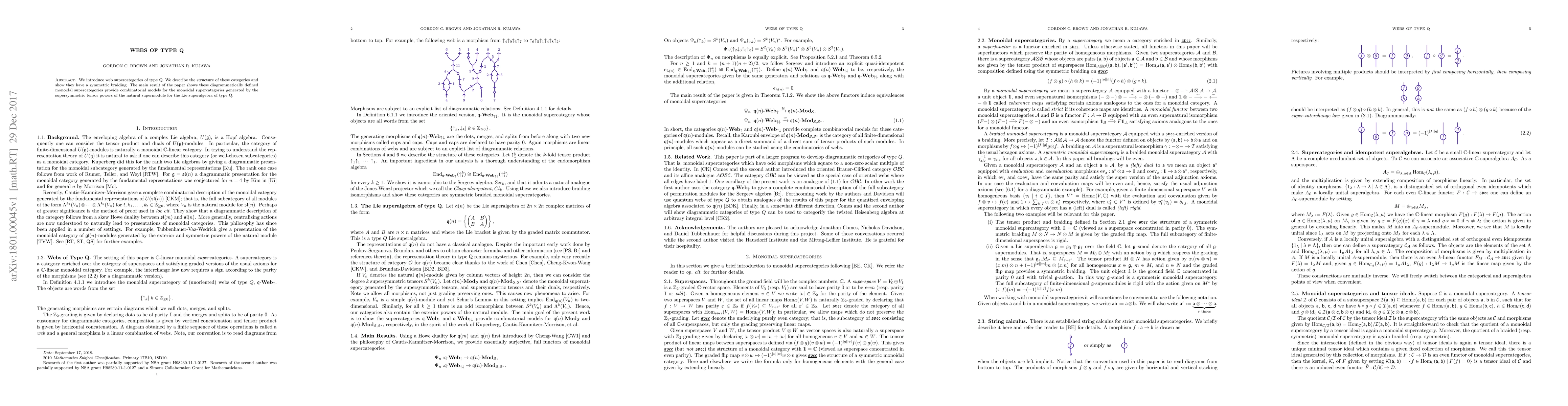 This paper introduces web supercategories of type Q, detailing their structure and symmetric braiding. It demonstrates that these diagrammatically defined monoidal supercategories serve as combinatorial models for those generated by supersymmetric tensor powers of the natural supermodule for the Lie superalgebra of type Q.