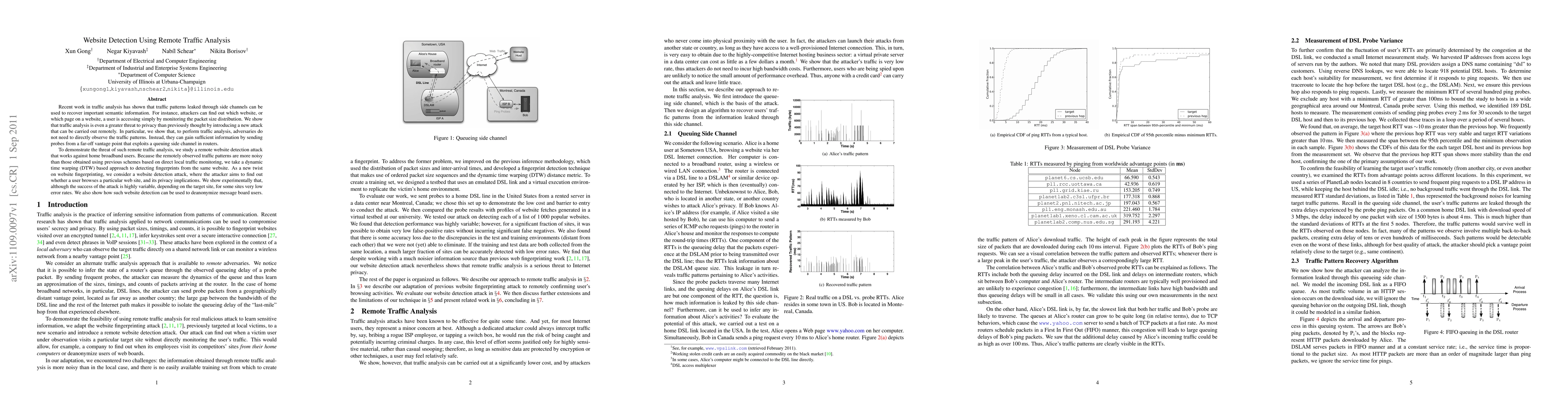 Recent work in traffic analysis has shown that traffic patterns leaked through side channels can be used to recover important semantic information. For instance, attackers can find out which website, or which page on a website, a user is accessing simply by monitoring the packet size distribution. We show that traffic analysis is even a greater threat to privacy than previously thought by introducing a new attack that can be carried out remotely. In particular, we show that, to perform traffic analysis, adversaries do not need to directly observe the traffic patterns. Instead, they can gain sufficient information by sending probes from a far-off vantage point that exploits a queuing side channel in routers. To demonstrate the threat of such remote traffic analysis, we study a remote website detection attack that works against home broadband users. Because the remotely observed traffic patterns are more noisy than those obtained using previous schemes based on direct local traffic monitoring, we take a dynamic time warping (DTW) based approach to detecting fingerprints from the same website. As a new twist on website fingerprinting, we consider a website detection attack, where the attacker aims to find out whether a user browses a particular web site, and its privacy implications. We show experimentally that, although the success of the attack is highly variable, depending on the target site, for some sites very low error rates. We also show how such website detection can be used to deanonymize message board users.