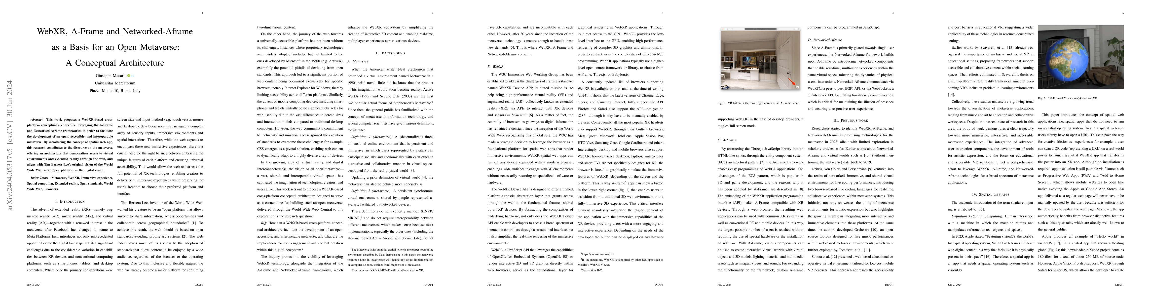 This paper presents a WebXR-based conceptual architecture using A-Frame and Networked-Aframe to develop an open, accessible metaverse. It aims to democratize virtual environments and align with the original vision of the World Wide Web as an open platform.