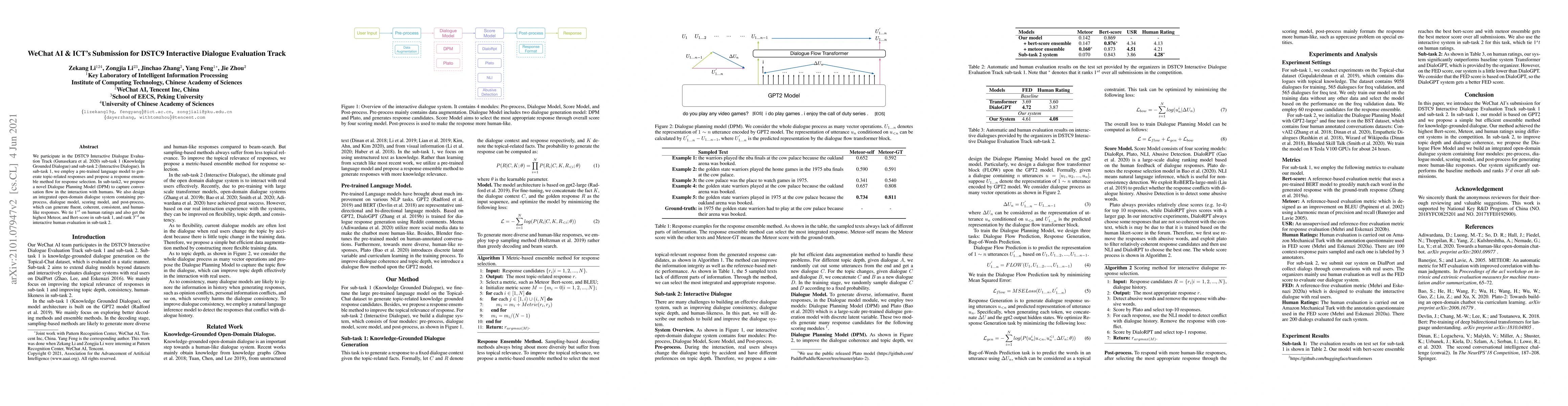 This paper describes a submission for the DSTC9 Interactive Dialogue Evaluation Track, focusing on two sub-tasks. It employs a pre-trained language model and a response ensemble method for sub-task 1, achieving top scores, and introduces a novel Dialogue Planning Model for sub-task 2, ranking 3rd in interactive human evaluation.