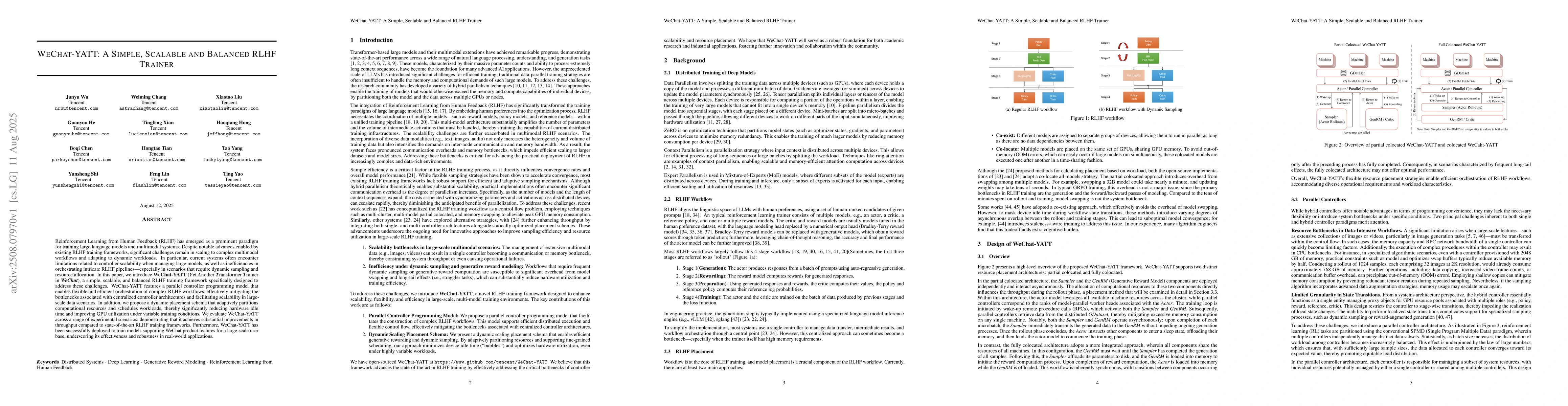 The paper introduces WeChat-YATT, a scalable RLHF training framework that addresses challenges in managing large models and complex workflows. It features a parallel controller model and dynamic resource allocation, significantly improving throughput and GPU utilization compared to existing frameworks, and has been successfully applied to train models for WeChat's large user base.