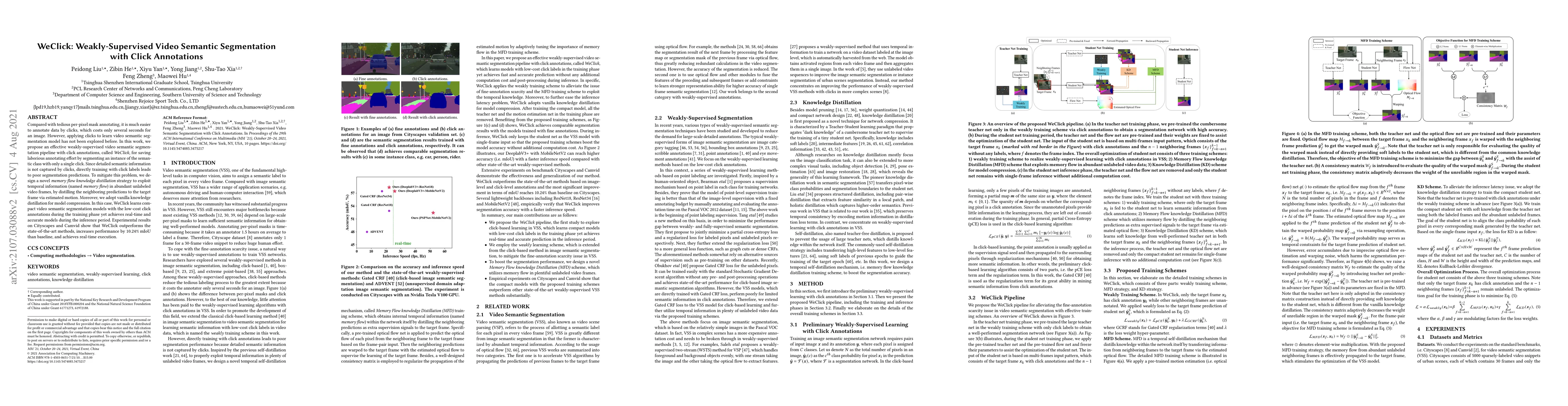 WeClick introduces a weakly-supervised video semantic segmentation method using click annotations, significantly reducing annotation effort. It employs memory flow knowledge distillation to leverage temporal information from unlabeled frames, achieving real-time and accurate segmentation with improved performance over state-of-the-art methods.