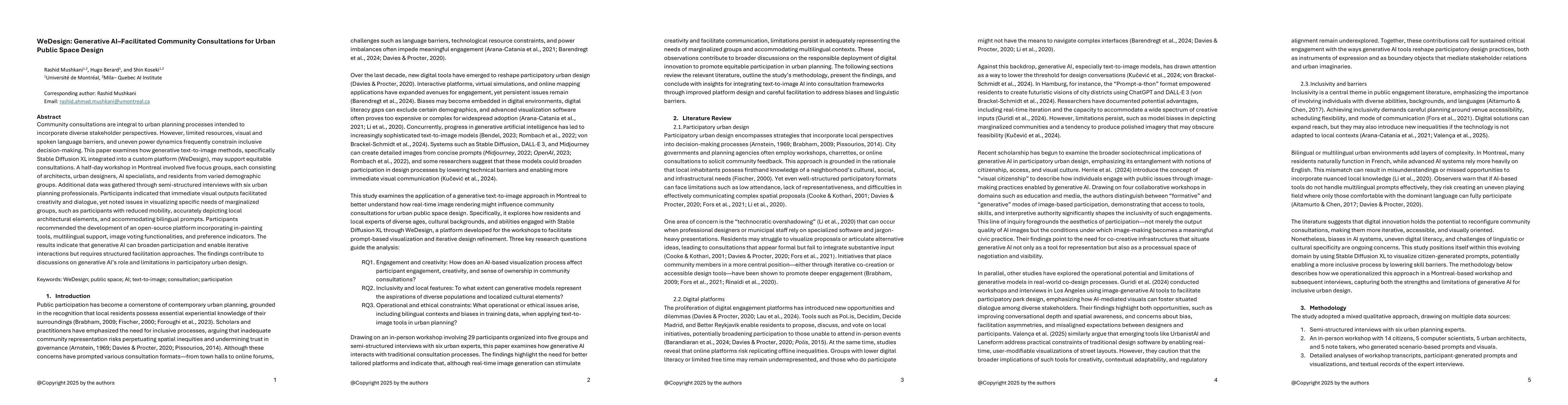 Community consultations are integral to urban planning processes intended to incorporate diverse stakeholder perspectives. However, limited resources, visual and spoken language barriers, and uneven power dynamics frequently constrain inclusive decision-making. This paper examines how generative text-to-image methods, specifically Stable Diffusion XL integrated into a custom platform (WeDesign), may support equitable consultations. A half-day workshop in Montreal involved five focus groups, each consisting of architects, urban designers, AI specialists, and residents from varied demographic groups. Additional data was gathered through semi-structured interviews with six urban planning professionals. Participants indicated that immediate visual outputs facilitated creativity and dialogue, yet noted issues in visualizing specific needs of marginalized groups, such as participants with reduced mobility, accurately depicting local architectural elements, and accommodating bilingual prompts. Participants recommended the development of an open-source platform incorporating in-painting tools, multilingual support, image voting functionalities, and preference indicators. The results indicate that generative AI can broaden participation and enable iterative interactions but requires structured facilitation approaches. The findings contribute to discussions on generative AI's role and limitations in participatory urban design.
