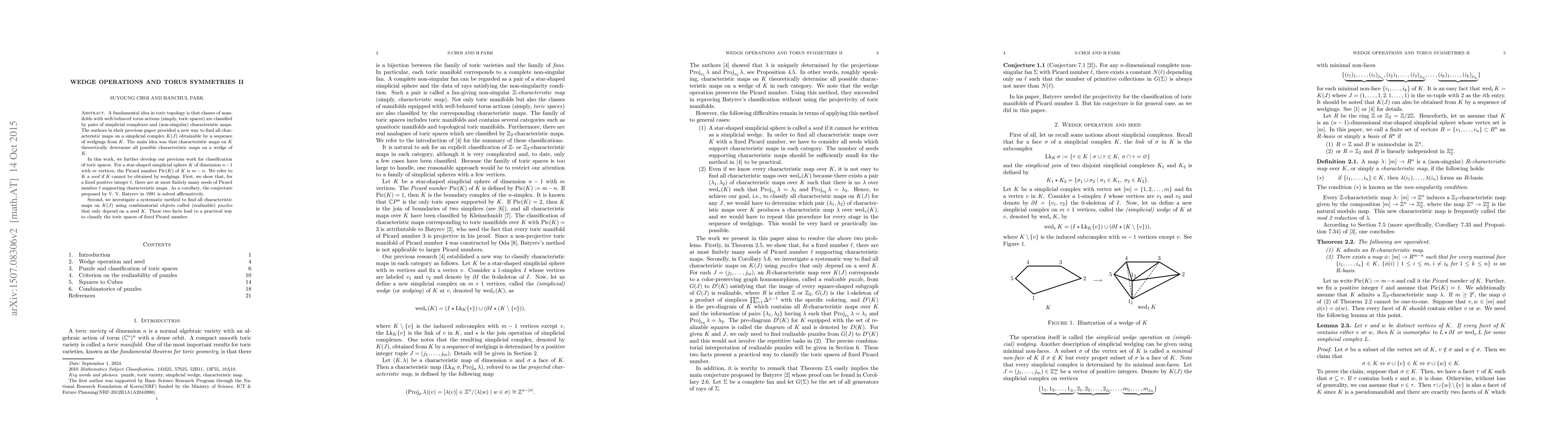 This paper extends previous work on classifying toric spaces by developing a method to find all characteristic maps on simplicial complexes obtained through wedging operations. It proves that there are finitely many "seed" simplicial complexes supporting characteristic maps for a given Picard number, thereby solving a conjecture by V. V. Batyrev. The authors also introduce puzzles as combinatorial objects to systematically identify characteristic maps, facilitating the classification of toric spaces with a fixed Picard number.