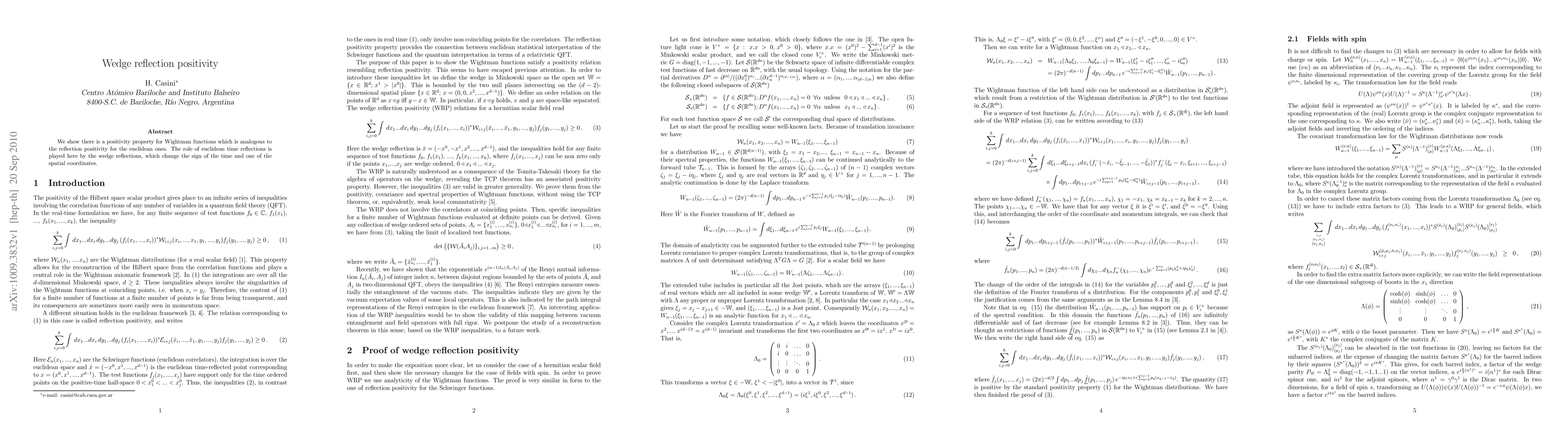 Summary: This paper demonstrates a positivity property for Wightman functions similar to reflection positivity in Euclidean space, achieved through wedge reflections that invert time and one spatial coordinate. This extends the concept of reflection positivity to Minkowski spacetime.