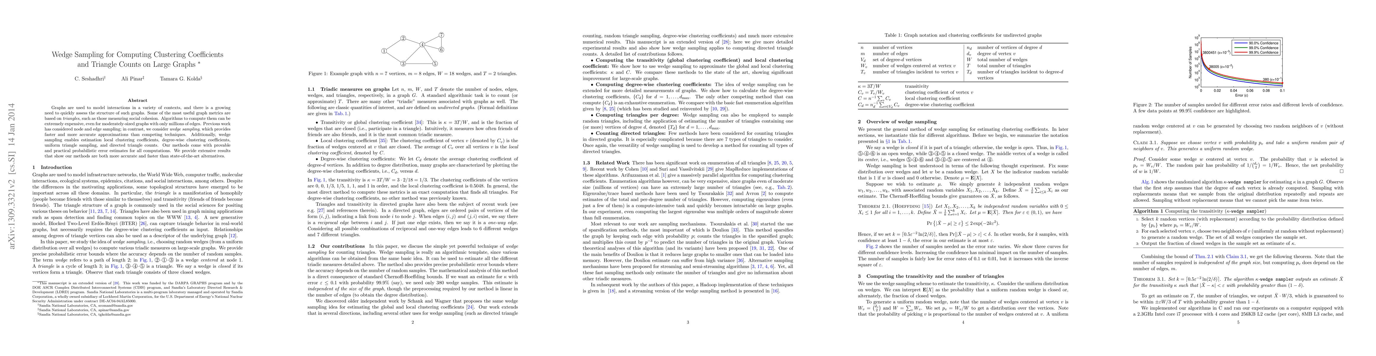 This paper proposes wedge sampling for efficiently computing clustering coefficients and triangle counts in large graphs, offering faster and more accurate approximations compared to node and edge sampling. The method also estimates local and degree-wise clustering coefficients, and provides uniform triangle sampling and directed triangle counts with probabilistic error estimates.
