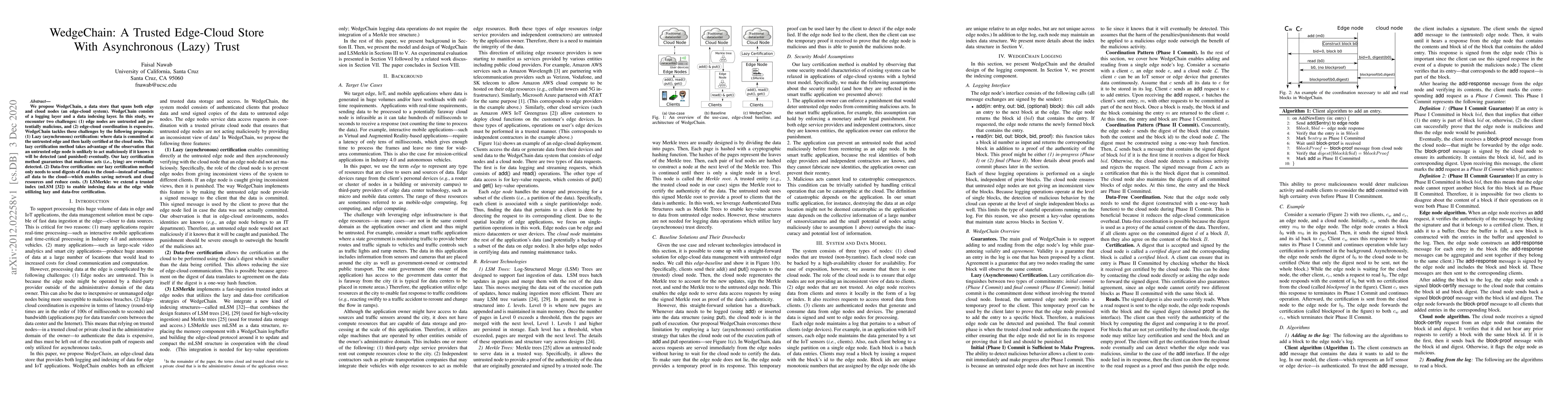 WedgeChain is a novel edge-cloud data store addressing the challenges of untrusted edge nodes and costly coordination. It employs lazy certification to detect eventual malicious behavior and data-free certification to reduce resource usage, alongside LSMerkle for efficient indexing.