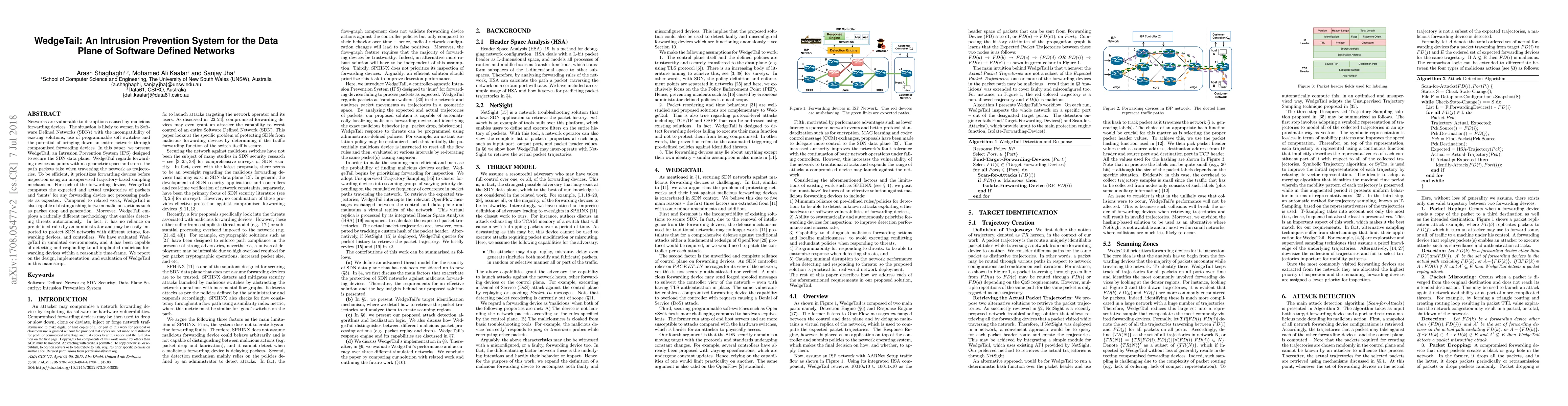 WedgeTail is an Intrusion Prevention System for Software Defined Networks' data plane, which identifies and mitigates threats by analyzing packet trajectories through forwarding devices. It autonomously detects anomalies without relying on pre-defined rules, offering a scalable and adaptable security solution for SDNs.
