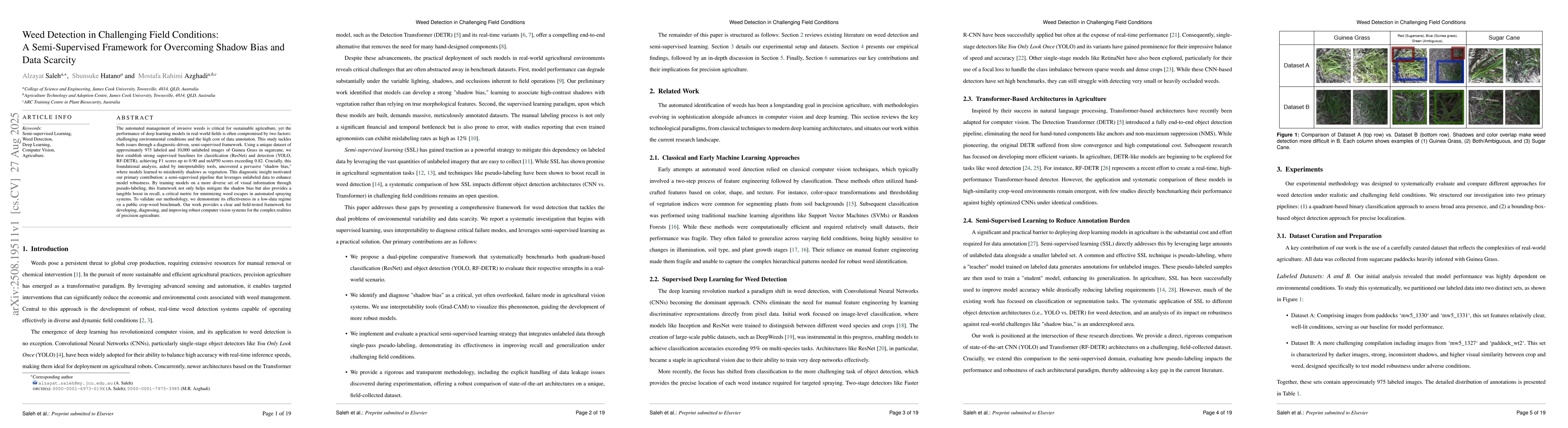 The automated management of invasive weeds is critical for sustainable agriculture, yet the performance of deep learning models in real-world fields is often compromised by two factors: challenging environmental conditions and the high cost of data annotation. This study tackles both issues through a diagnostic-driven, semi-supervised framework. Using a unique dataset of approximately 975 labeled and 10,000 unlabeled images of Guinea Grass in sugarcane, we first establish strong supervised baselines for classification (ResNet) and detection (YOLO, RF-DETR), achieving F1 scores up to 0.90 and mAP50 scores exceeding 0.82. Crucially, this foundational analysis, aided by interpretability tools, uncovered a pervasive "shadow bias," where models learned to misidentify shadows as vegetation. This diagnostic insight motivated our primary contribution: a semi-supervised pipeline that leverages unlabeled data to enhance model robustness. By training models on a more diverse set of visual information through pseudo-labeling, this framework not only helps mitigate the shadow bias but also provides a tangible boost in recall, a critical metric for minimizing weed escapes in automated spraying systems. To validate our methodology, we demonstrate its effectiveness in a low-data regime on a public crop-weed benchmark. Our work provides a clear and field-tested framework for developing, diagnosing, and improving robust computer vision systems for the complex realities of precision agriculture.