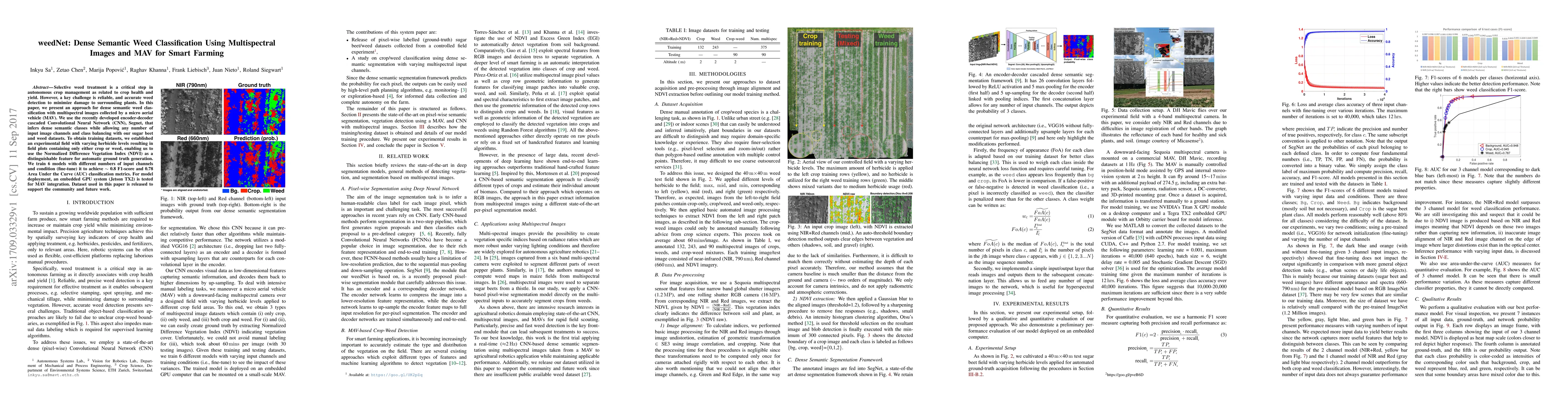 This paper introduces weedNet, a method for dense semantic weed classification using multispectral images from a micro aerial vehicle (MAV) for smart farming. It employs a Segnet CNN to accurately classify weeds while minimizing crop damage, achieving an F1-score of 0.8 and an AUC of 0.78, and deploys the model on an embedded GPU system for MAV integration.