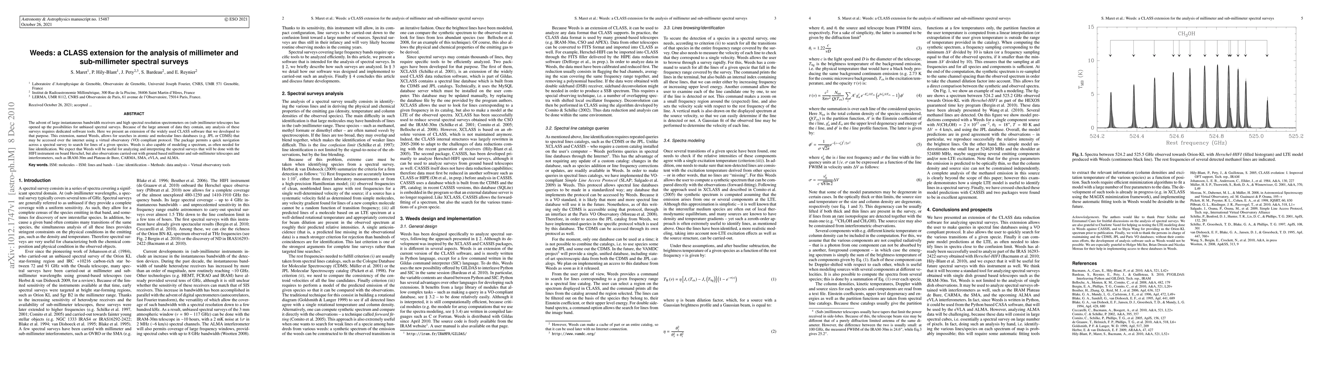 The advent of large instantaneous bandwidth receivers and high spectral resolution spectrometers on (sub-)millimeter telescopes has opened up the possibilities for unbiased spectral surveys. Because of the large amount of data they contain, any analysis of these surveys requires dedicated software tools. Here we present an extension of the widely used CLASS software that we developed to that purpose. This extension, named Weeds, allows for searches in atomic and molecular lines databases (e.g. JPL or CDMS) that may be accessed over the internet using a virtual observatory (VO) compliant protocol. The package permits a quick navigation across a spectral survey to search for lines of a given species. Weeds is also capable of modeling a spectrum, as often needed for line identification. We expect that Weeds will be useful for analyzing and interpreting the spectral surveys that will be done with the HIFI instrument on board Herschel, but also observations carried-out with ground based millimeter and sub-millimeter telescopes and interferometers, such as IRAM-30m and Plateau de Bure, CARMA, SMA, eVLA, and ALMA.
