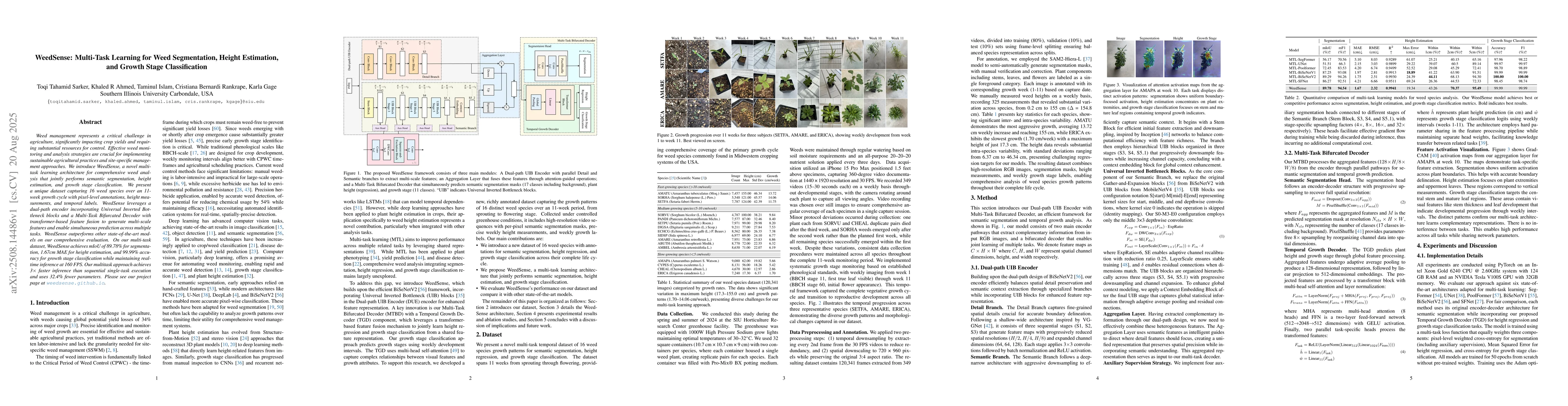 The research introduces WeedSense, a multi-task learning architecture for comprehensive weed analysis, which performs semantic segmentation, height estimation, and growth stage classification simultaneously using RGB imagery. It leverages a dual-path encoder with Universal Inverted Bottleneck blocks and a Multi-Task Bifurcated Decoder with transformer-based feature fusion.