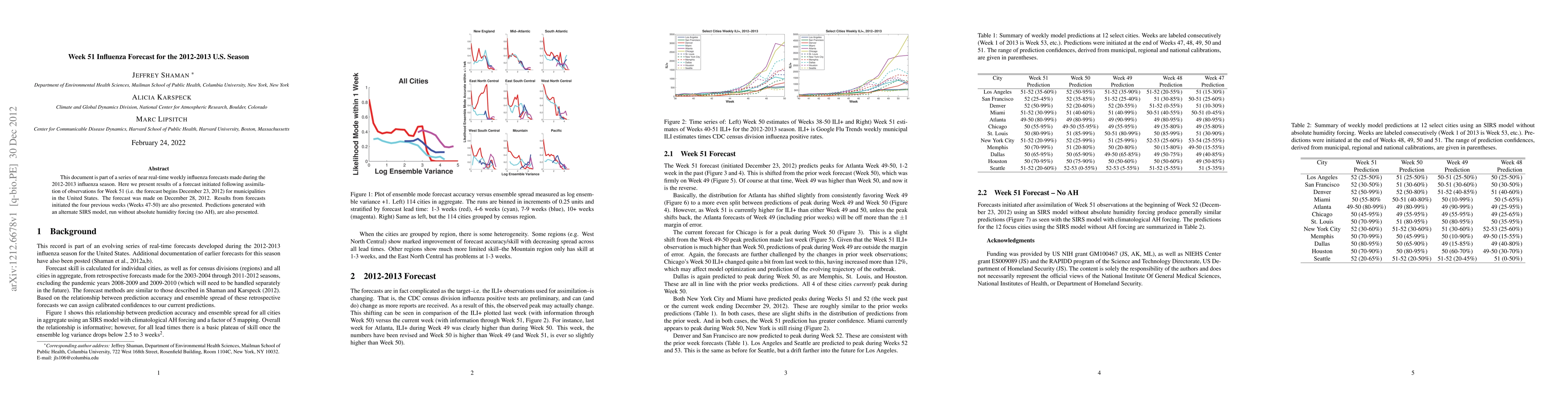 This document is part of a series of near real-time weekly influenza forecasts made during the 2012-2013 influenza season. Here we present results of a forecast initiated following assimilation of observations for Week 51 (i.e. the forecast begins December 23, 2012) for municipalities in the United States. The forecast was made on December 28, 2012. Results from forecasts initiated the four previous weeks (Weeks 47-50) are also presented. Predictions generated with an alternate SIRS model, run without absolute humidity forcing (no AH), are also presented.