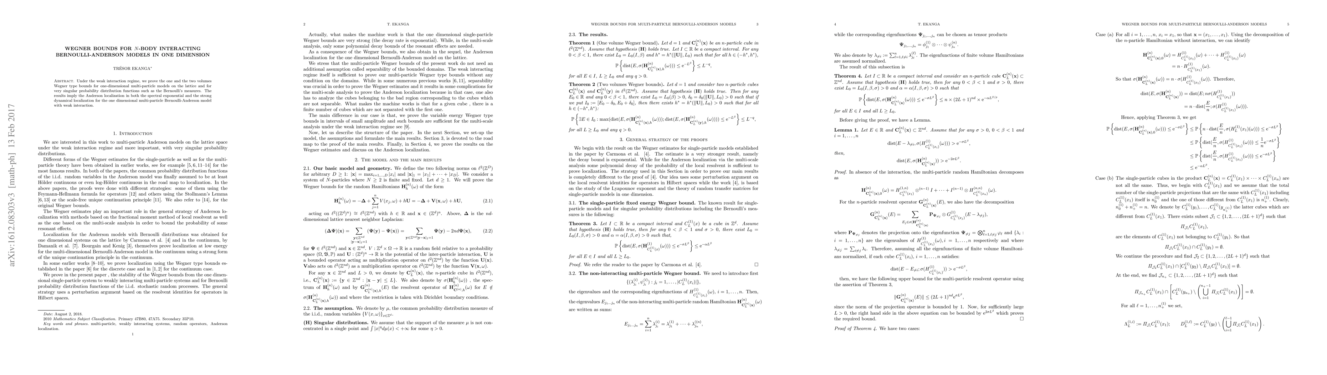 Summary: This paper establishes Wegner bounds for one-dimensional multi-particle Bernoulli-Anderson models under weak interaction, demonstrating Anderson localization in both spectral and dynamical aspects. The results apply to singular probability distributions like Bernoulli measures.
