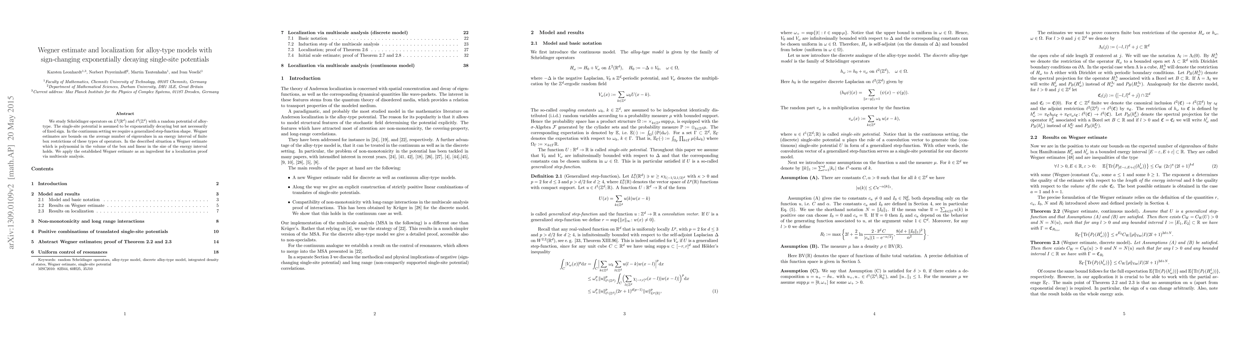 This paper investigates Schrödinger operators with alloy-type random potentials featuring exponentially decaying, sign-changing single-site potentials. It establishes a Wegner estimate that provides bounds on the average number of eigenvalues in energy intervals, which is polynomial in the box volume and linear in the energy interval size, and uses this to prove localization via multiscale analysis.