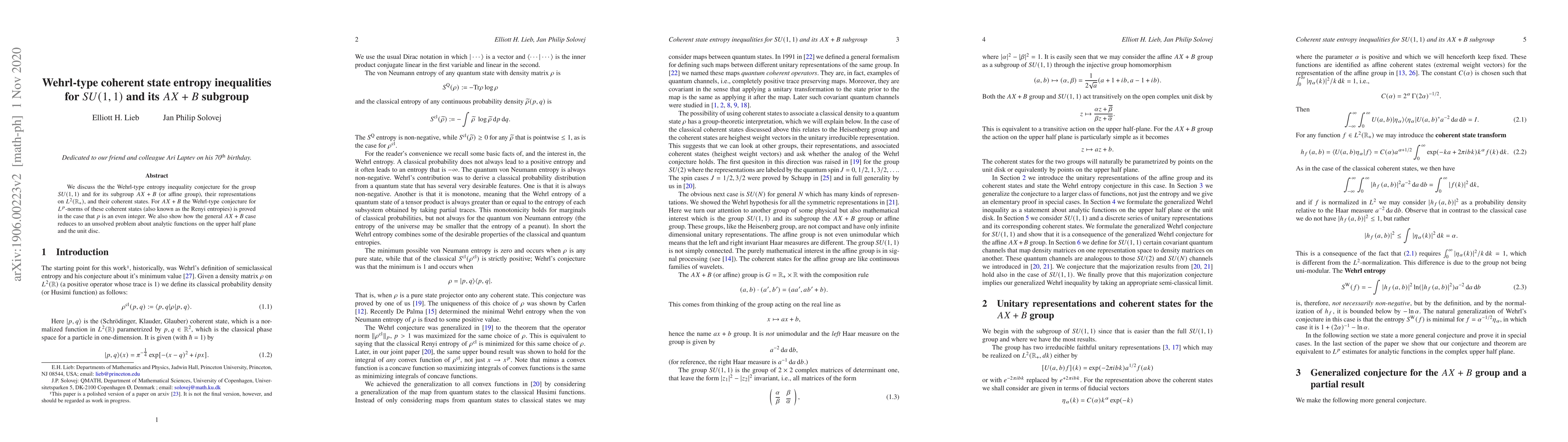 We discuss the Wehrl-type entropy inequality conjecture for the group $SU(1,1)$ and for its subgroup $AX+B$ (or affine group), their representations on $L^2({\mathbb R}_+)$, and their coherent states. For $AX+B$ the Wehrl-type conjecture for $L^p$-norms of these coherent states (also known as the R\'enyi entropies) is proved in the case that $p$ is an even integer. We also show how the general $AX+B$ case reduces to an unsolved problem about analytic functions on the upper half plane and the unit disc.