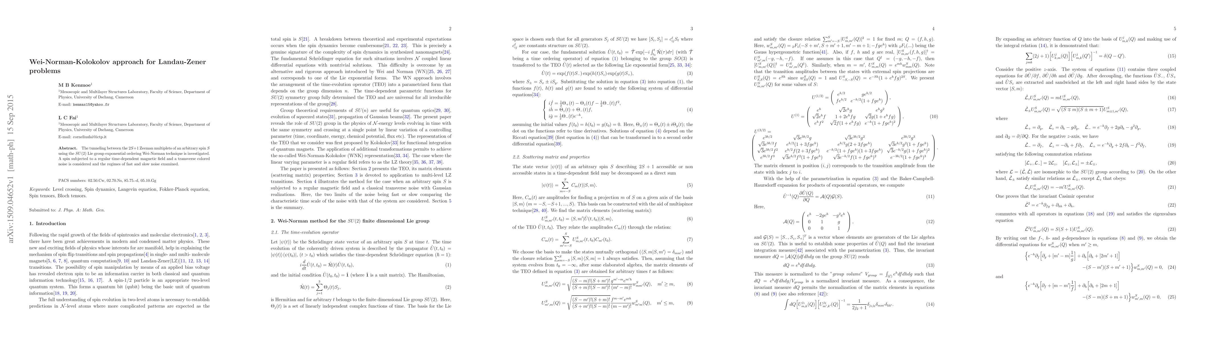 Summary: This paper explores tunneling dynamics in spin systems using the Wei-Norman-Kolokolov approach, focusing on $SU(2)$ Lie group techniques to analyze transitions between Zeeman multiplets under time-dependent magnetic fields and colored noise, distinguishing between fast and slow noise regimes.