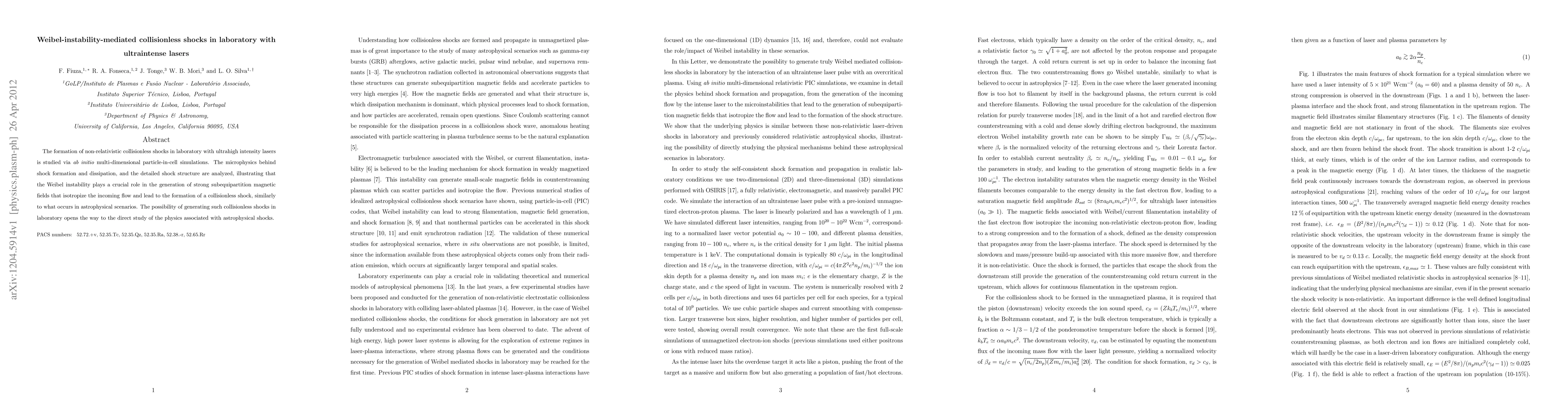 This paper investigates the formation of non-relativistic collisionless shocks in laboratory settings using ultraintense lasers, revealing that the Weibel instability generates strong magnetic fields crucial for shock formation. The study highlights the potential for laboratory simulations to explore astrophysical shock physics.