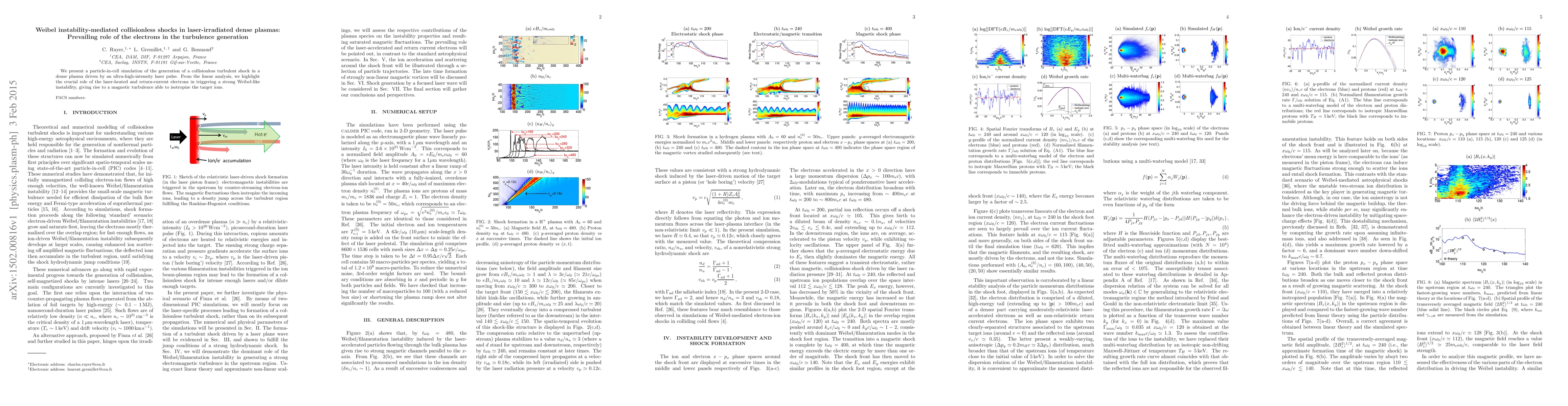 This paper uses particle-in-cell simulations to study the generation of collisionless shocks in dense plasmas driven by ultra-high-intensity laser pulses, highlighting the pivotal role of laser-heated and return-current electrons in triggering a Weibel-like instability that creates magnetic turbulence.
