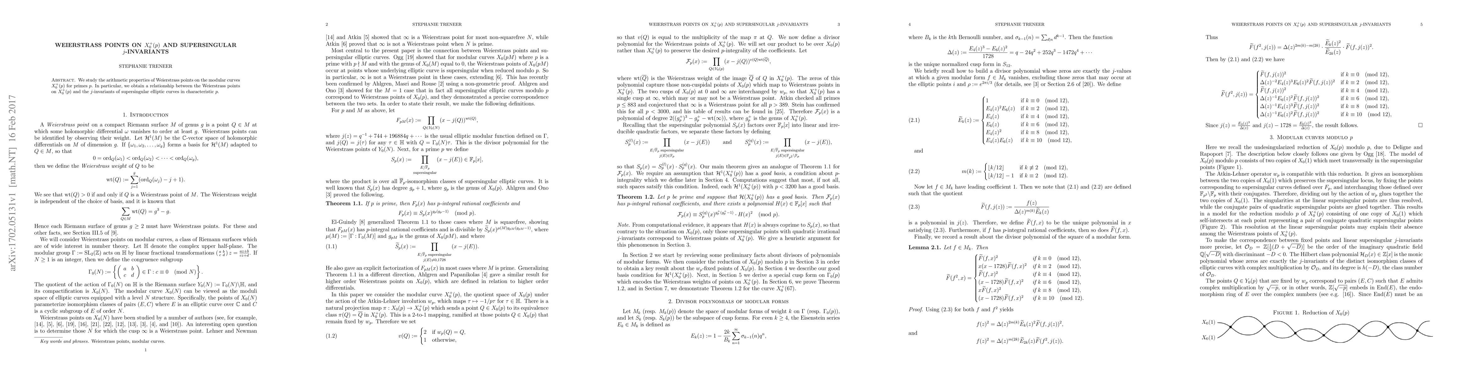 This paper explores the arithmetic characteristics of Weierstrass points on modular curves $X_0^+(p)$ for primes $p$, revealing a connection between these points and the $j$-invariants of supersingular elliptic curves in characteristic $p$.