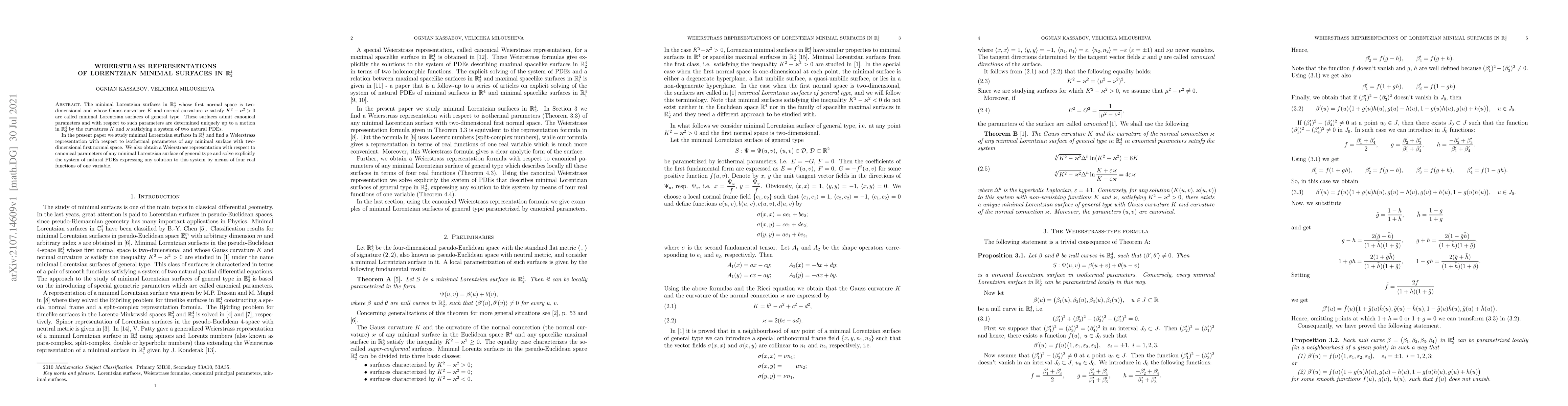 The minimal Lorentzian surfaces in $\mathbb{R}^4_2$ whose first normal space is two-dimensional and whose Gauss curvature $K$ and normal curvature $\varkappa$ satisfy $K^2-\varkappa^2 >0$ are called minimal Lorentzian surfaces of general type. These surfaces admit canonical parameters and with respect to such parameters are determined uniquely up to a motion in $\mathbb{R}^4_2$ by the curvatures $K$ and $\varkappa$ satisfying a system of two natural PDEs. In the present paper we study minimal Lorentzian surfaces in $\mathbb{R}^4_2$ and find a Weierstrass representation with respect to isothermal parameters of any minimal surface with two-dimensional first normal space. We also obtain a Weierstrass representation with respect to canonical parameters of any minimal Lorentzian surface of general type and solve explicitly the system of natural PDEs expressing any solution to this system by means of four real functions of one variable.