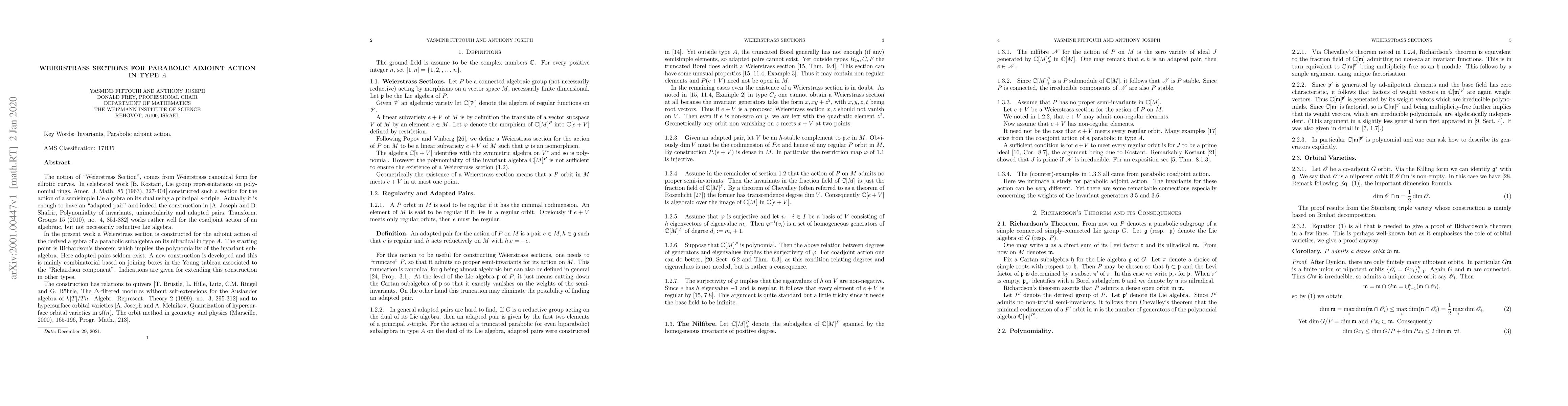 The notion of "Weierstrass Section", comes from Weierstrass canonical form for elliptic curves. In celebrated work [B. Kostant, Lie group representations on polynomial rings, Amer. J. Math. 85 (1963), 327-404] constructed such a section for the action of a semisimple Lie algebra on its dual using a principal s-triple. Actually it is enough to have an "adapted pair" and indeed the construction in [A. Joseph and D. Shafrir, Polynomiality of invariants, unimodularity and adapted pairs, Transform. Groups 15 (2010), no. 4, 851-882] works rather well for the coadjoint action of an algebraic, but not necessarily reductive Lie algebra. In the present work a Weierstrass section is constructed for the adjoint action of the derived algebra of a parabolic subalgebra on its nilradical in type $A$. The starting point is Richardson's theorem which implies the polynomiality of the invariant sub-algebra. Here adapted pairs seldom exist. A new construction is developed and this is mainly combinatorial based on joining boxes in the Young tableau associated to the "Richardson component". Indications are given for extending this construction in other types. The construction has relations to quivers [T. Brustle, L. Hille, Lutz, C.M. Ringel and G. Rohrle, The $\delta$-filtered modules without selfextensions for the Auslander algebra of $k[T]/Tn$. Algebr. Represent. Theory 2 (1999), no. 3, 295-312] and to hypersurface orbital varieties [A. Joseph and A. Melnikov, Quantization of hypersurface orbital varieties in $sl(n)$. The orbit method in geometry and physics (Marseille, 2000), 165-196, Progr. Math., 213].