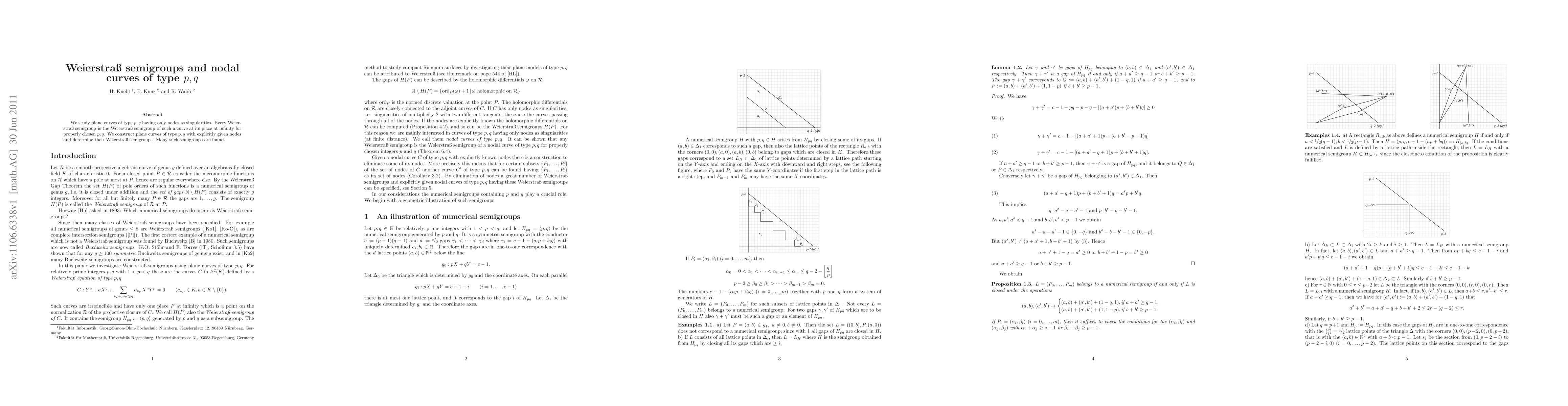 This paper investigates plane curves of type p,q with only nodal singularities, demonstrating that each Weierstrass semigroup corresponds to such a curve at its infinity. The authors construct specific curves with given nodes and determine their associated Weierstrass semigroups, uncovering numerous such semigroups.