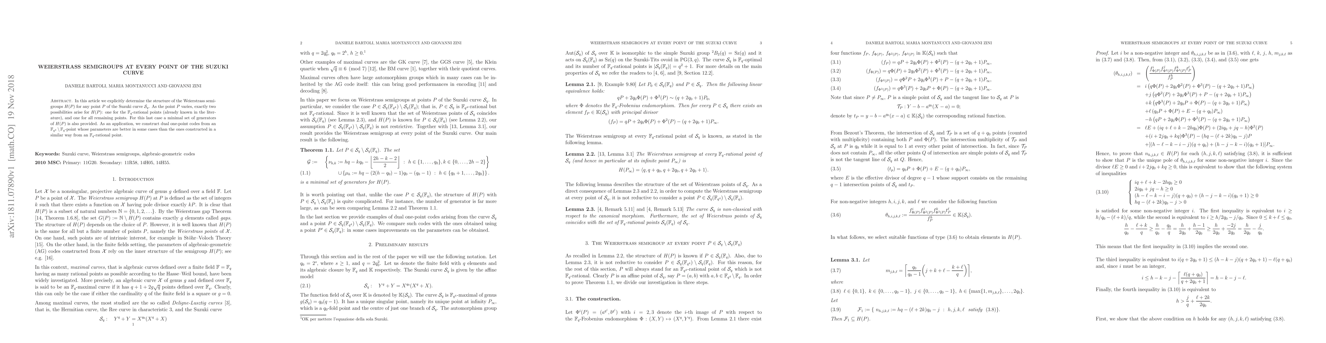 In this article we explicitly determine the structure of the Weierstrass semigroups $H(P)$ for any point $P$ of the Suzuki curve $\mathcal{S}_q$. As the point $P$ varies, exactly two possibilities arise for $H(P)$: one for the $\mathbb{F}_q$-rational points (already known in the literature), and one for all remaining points. For this last case a minimal set of generators of $H(P)$ is also provided. As an application, we construct dual one-point codes from an $\mathbb{F}_{q^4}\setminus\fq$-point whose parameters are better in some cases than the ones constructed in a similar way from an $\fq$-rational point.