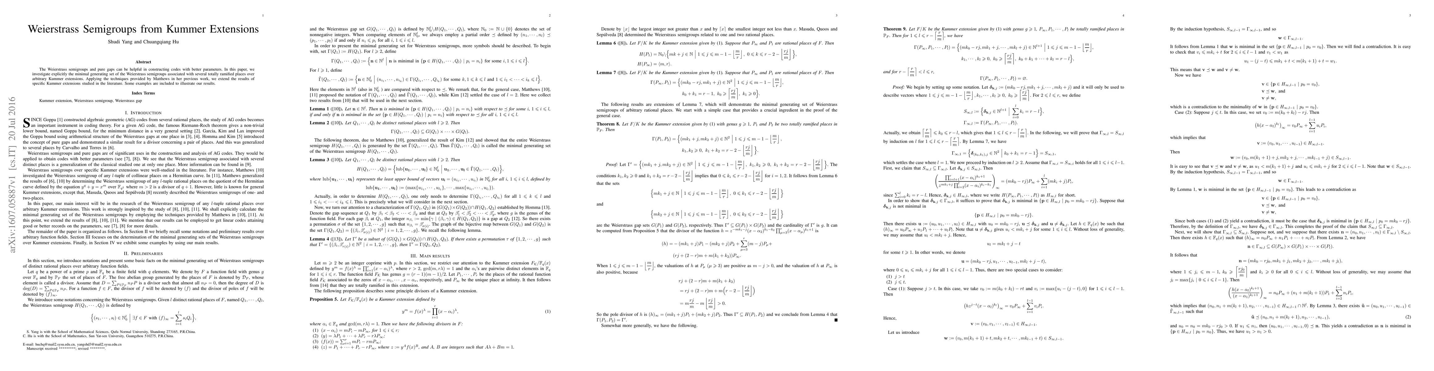 This paper investigates the minimal generating sets of Weierstrass semigroups linked to totally ramified places in Kummer extensions, extending previous results and providing examples to illustrate the findings. The study aims to improve code construction with better parameters using Weierstrass semigroups and pure gaps.