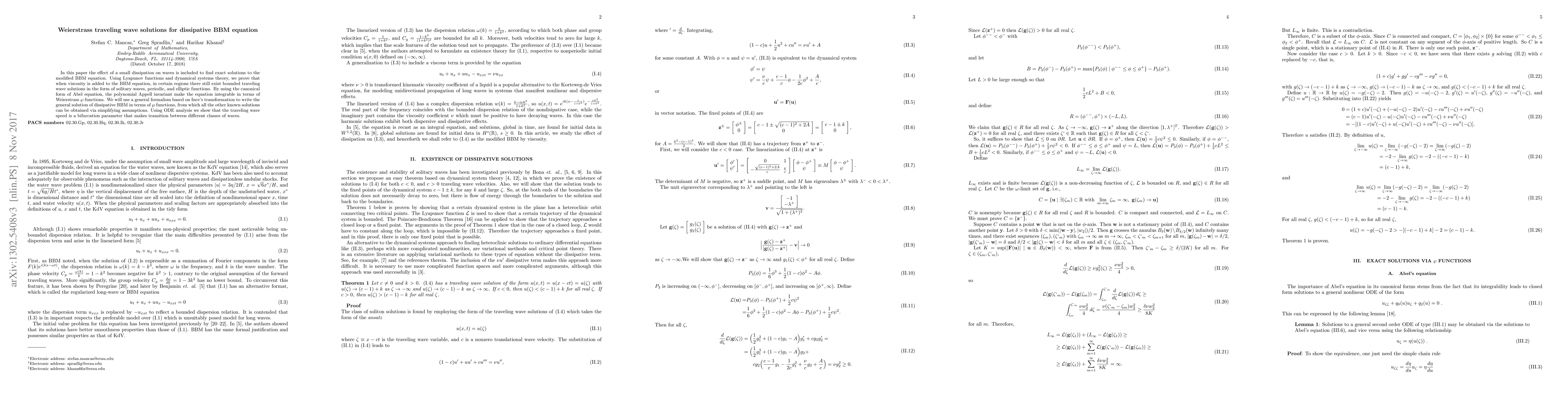 This research investigates exact solutions for a dissipative BBM equation with small dissipation, proving the existence of bounded traveling wave solutions—solitary waves, periodic, and elliptic functions—using dynamical systems theory and Weierstrass $\wp$ functions. The study employs Ince's transformation and ODE analysis to establish a general solution and show how wave speed acts as a bifurcation parameter.