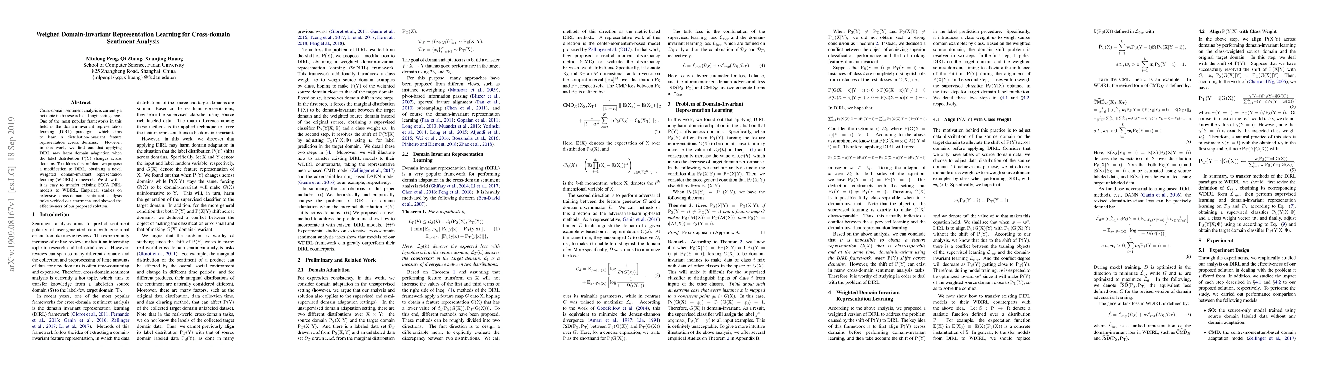 This paper proposes a weighted domain-invariant representation learning (WDIRL) framework to address the issue of label distribution changes across domains in domain-invariant representation learning (DIRL). Empirical studies demonstrate the effectiveness of WDIRL in cross-domain sentiment analysis tasks.