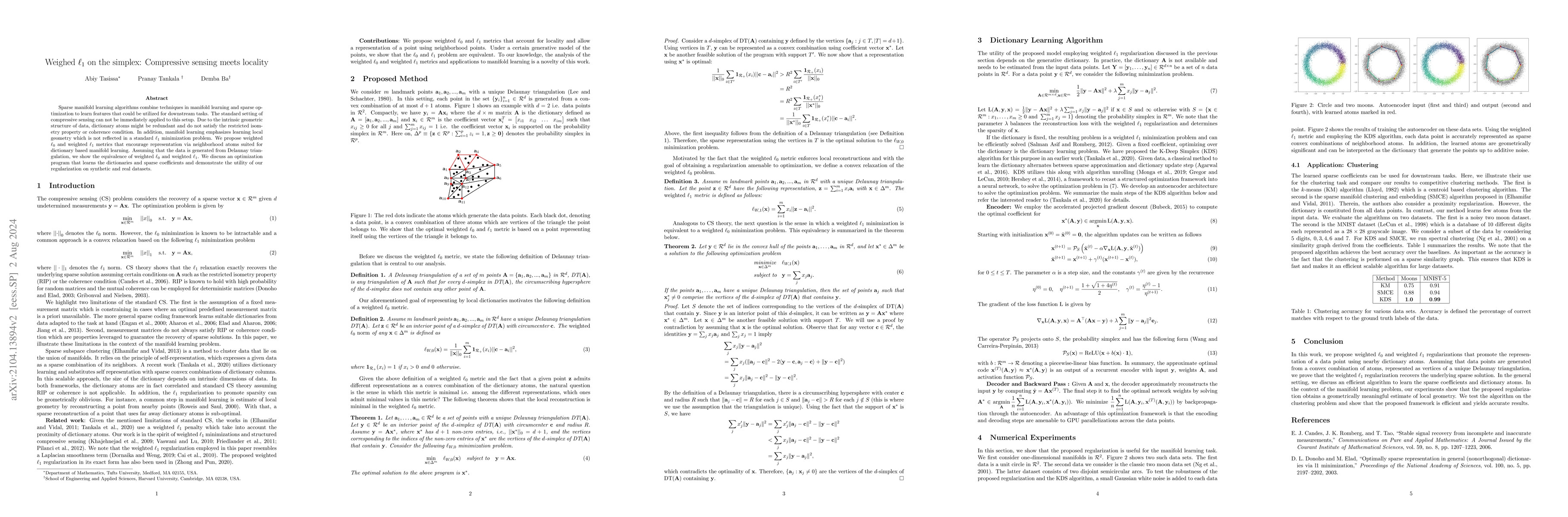 This paper proposes weighted $\ell_1$ metrics for sparse manifold learning on the simplex, addressing the limitations of standard compressive sensing in capturing local geometry. The authors demonstrate the equivalence of weighted $\ell_1$ and $\ell_0$ metrics and present an optimization program to learn dictionaries and sparse coefficients, showing effectiveness on both synthetic and real datasets.