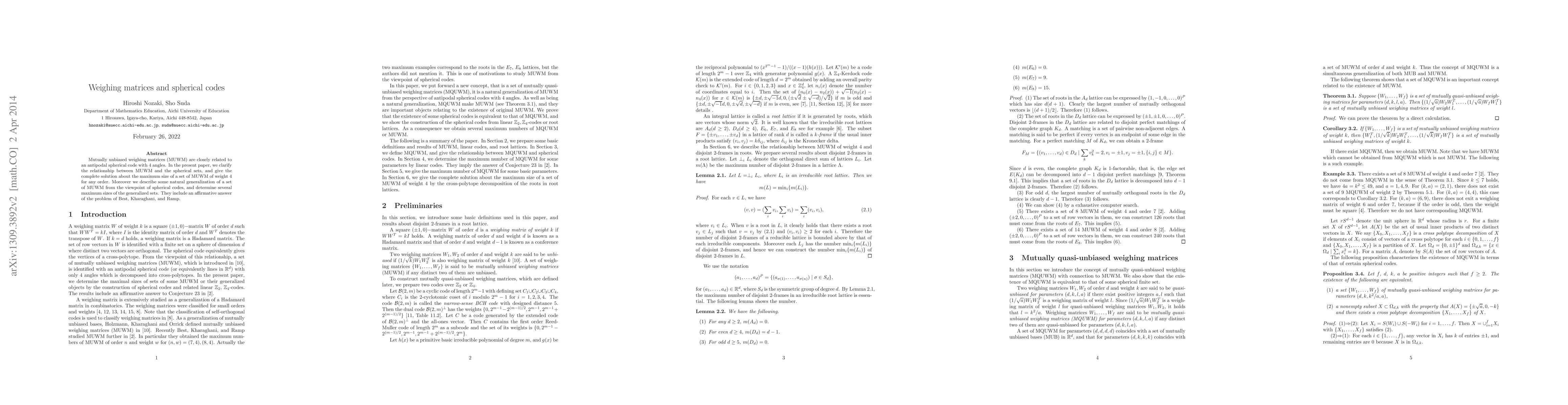 This paper explores the relationship between mutually unbiased weighing matrices (MUWM) and antipodal spherical codes, providing a complete solution for the maximum size of MUWM of weight 4 for any order. It also generalizes MUWM in the context of spherical codes and resolves the problem posed by Best, Kharaghani, and Ramp.