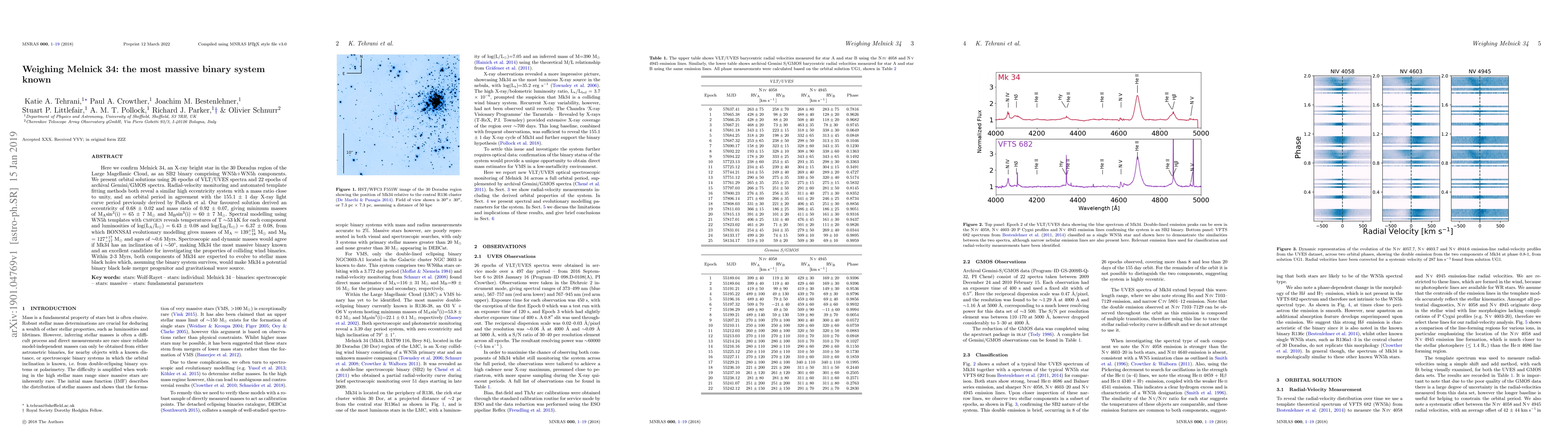 Here we confirm Melnick 34, an X-ray bright star in the 30 Doradus region of the Large Magellanic Cloud, as an SB2 binary comprising WN5h+WN5h components. We present orbital solutions using 26 epochs of VLT/UVES spectra and 22 epochs of archival Gemini/GMOS spectra. Radial-velocity monitoring and automated template fitting methods both reveal a similar high eccentricity system with a mass ratio close to unity, and an orbital period in agreement with the 155.1 +/- 1 day X-ray light curve period previously derived by Pollock et al. Our favoured solution derived an eccentricity of 0.68 +/- 0.02 and mass ratio of 0.92 +/- 0.07, giving minimum masses of Ma_sin^{3}(i) = 65 +/- 7 Msun and Mb_sin^{3}(i) = 60 +/- 7 Msun. Spectral modelling using WN5h templates with CMFGEN reveals temperatures of T ~53 kK for each component and luminosities of log(La/Lsun) = 6.43 +/- 0.08 and log(Lb/Lsun) = 6.37 +/- 0.08, from which BONNSAI evolutionary modelling gives masses of Ma = 139 (+21,-18) Msun and Mb = 127 (+17,-17) Msun and ages of ~0.6 Myrs. Spectroscopic and dynamic masses would agree if Mk34 has an inclination of i ~50{\deg}, making Mk34 the most massive binary known and an excellent candidate for investigating the properties of colliding wind binaries. Within 2-3 Myrs, both components of Mk34 are expected to evolve to stellar mass black holes which, assuming the binary system survives, would make Mk34 a potential binary black hole merger progenitor and gravitational wave source.