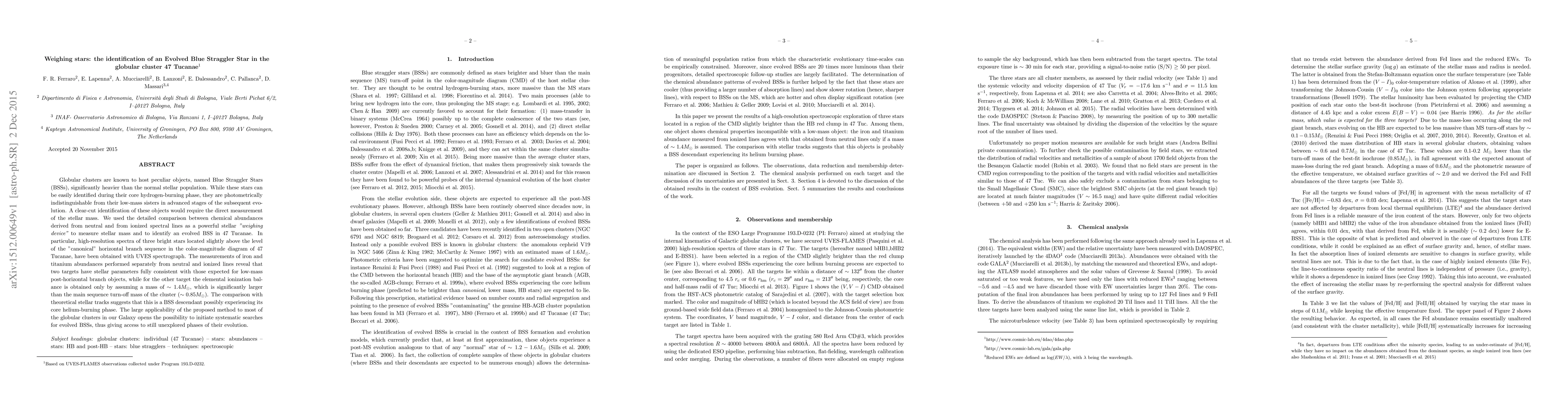 This paper identifies an evolved Blue Straggler Star (BSS) in the globular cluster 47 Tucanae using high-resolution spectroscopy to measure stellar mass through chemical abundances. The analysis reveals one star with a mass of ~1.4Msol, significantly heavier than typical cluster stars, suggesting it is an evolved BSS undergoing core helium-burning.
