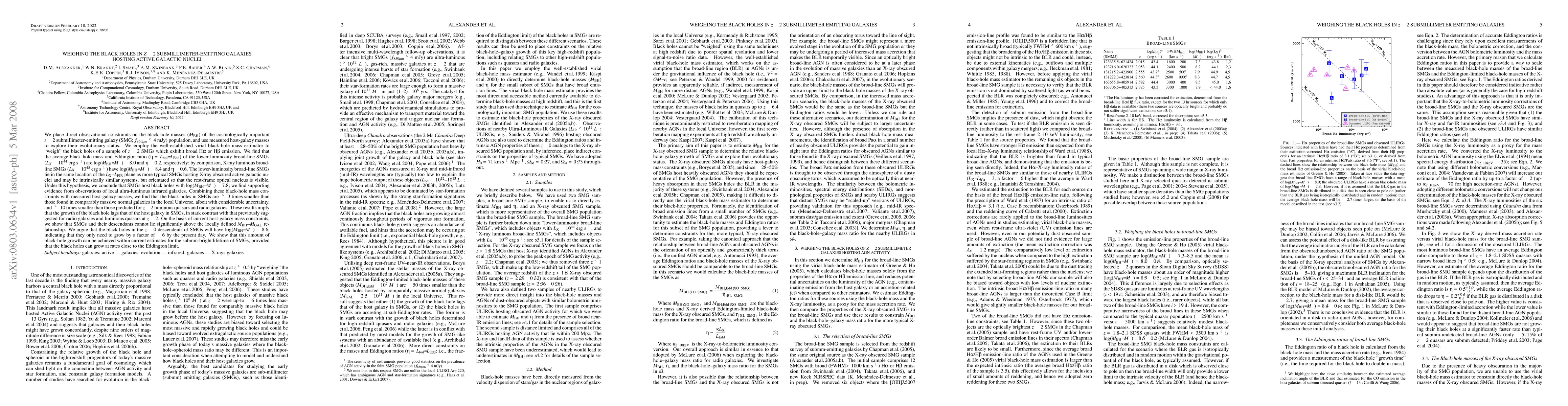 We place direct observational constraints on the black-hole masses of the cosmologically important z~2 submillimeter-emitting galaxy (SMG; f850>4mJy) population, and use measured host-galaxy masses to explore their evolutionary status. We employ the well-established virial black-hole mass estimator to 'weigh' the black holes of a sample of z~2 SMGs with broad Halpha or Hbeta emission. The average black-hole mass and Eddington ratio (eta) of the lower-luminosity broad-line SMGs (L_X~10^44 erg/s} are log(M_BH/M_sol)~8.0 and eta~0.2, respectively. These lower-luminosity broad-line SMGs lie in the same location of the L_X-L_FIR plane as more typical SMGs hosting X-ray obscured AGN and may be intrinsically similar systems, but orientated so that the rest-frame optical nucleus is visible. Under this hypothesis, we conclude that SMGs host black holes with log(M_BH/M_odot)~7.8; we find supporting evidence from observations of local ULIRGs. Combining these black-hole mass constraints with measured host-galaxy masses, we find that the black holes in SMGs are >3 times smaller than those found in comparably massive normal galaxies in the local Universe, albeit with considerable uncertainty, and >10 times smaller than those predicted for z~2 luminous quasars and radio galaxies. These results imply that the growth of the black hole lags that of the host galaxy in SMGs, in stark contrast with that previously suggested for radio galaxies and luminous quasars at z~2. On the basis of current host-galaxy mass constraints, we show that SMGs and their descendants cannot lie significantly above the locally defined M_BH-M_GAL relationship. We argue that the black holes in the z~0 descendents of SMGs will have log(M_BH/M_odot)~8.6, indicating that they only need to grow by a factor of ~6 by the present day (ABRIDGED).
