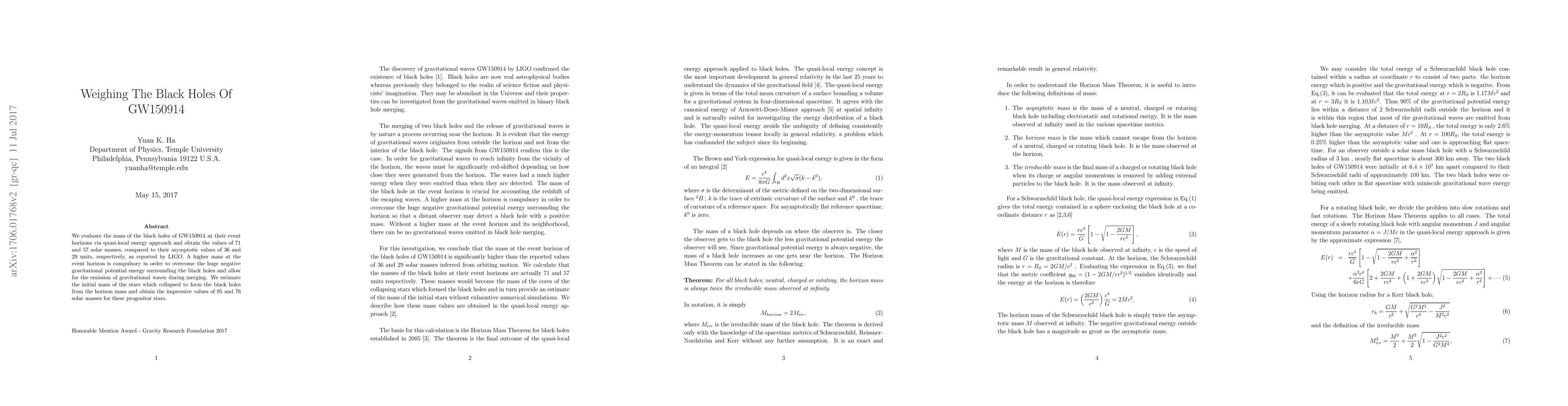We evaluate the mass of the black holes of GW150914 at their event horizons via quasi-local energy approach and obtain the values of 71 and 57 solar masses, compared to their asymptotic values of 36 and 29 units, respectively, as reported by LIGO. A higher mass at the event horizon is compulsory in order to overcome the huge negative gravitational potential energy surrounding the black holes and allow for the emission of gravitational waves during merging. We estimate the initial mass of the stars which collapsed to form the black holes from the horizon mass and obtain the impressive values of 95 and 76 solar masses for these progenitor stars.