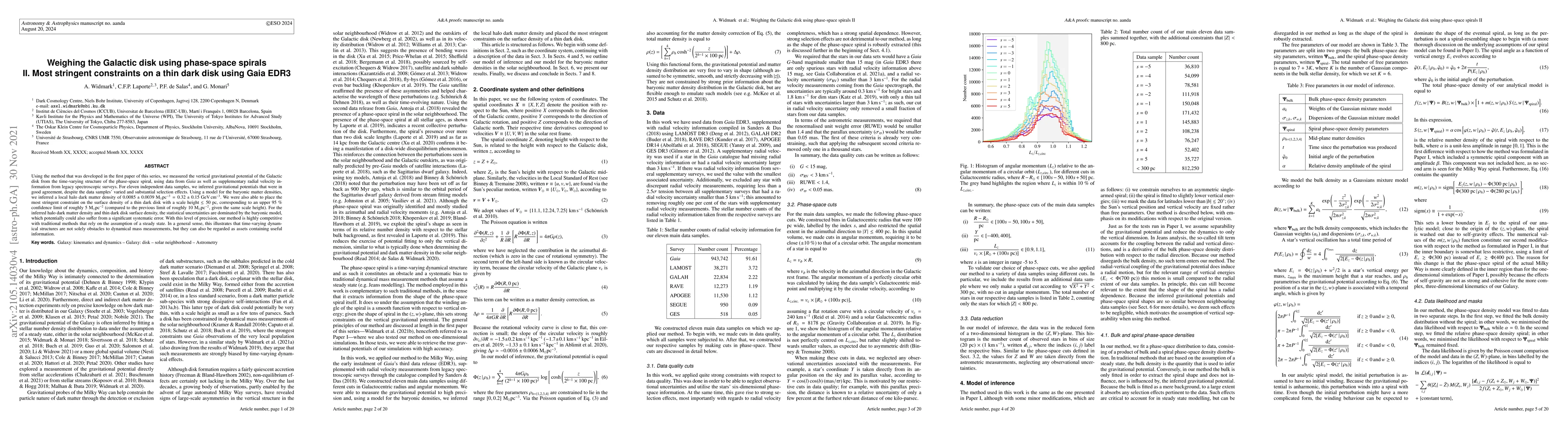 This paper uses Gaia EDR3 data and phase-space spirals to measure the vertical gravitational potential of the Galactic disk, inferring a local halo dark matter density and placing the most stringent constraint on the surface density of a thin dark disk. The method provides a significant improvement over previous limits, demonstrating that time-varying structures can enhance dynamical mass measurements.