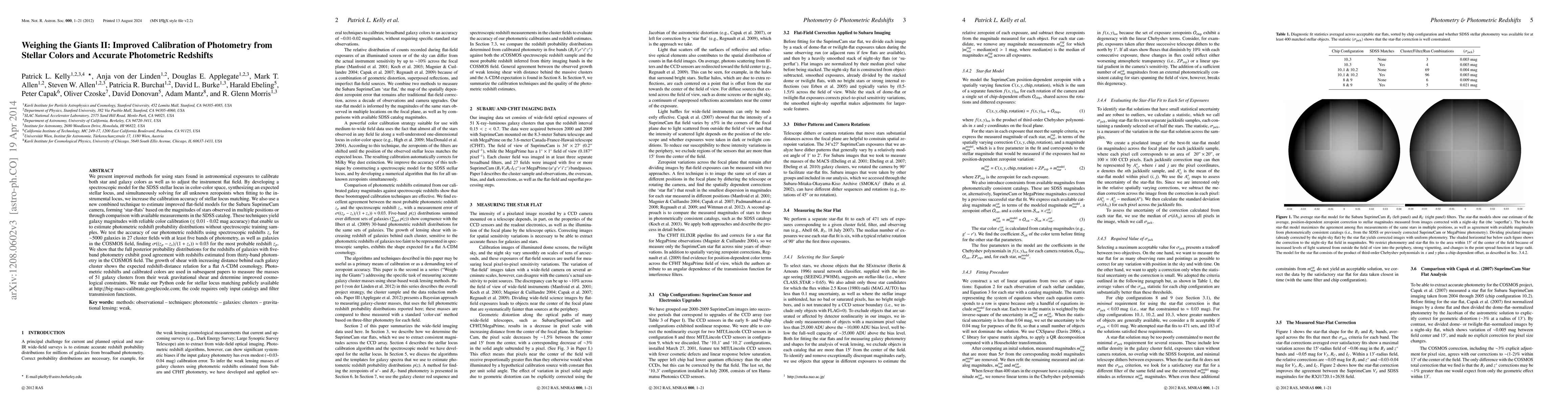 We present improved methods for using stars found in astronomical exposures to calibrate both star and galaxy colors as well as to adjust the instrument flat field. By developing a spectroscopic model for the SDSS stellar locus in color-color space, synthesizing an expected stellar locus, and simultaneously solving for all unknown zeropoints when fitting to the instrumental locus, we increase the calibration accuracy of stellar locus matching. We also use a new combined technique to estimate improved flat-field models for the Subaru SuprimeCam camera, forming `star flats' based on the magnitudes of stars observed in multiple positions or through comparison with available SDSS magnitudes. These techniques yield galaxy magnitudes with reliable color calibration (< 0.01 - 0.02 mag accuracy) that enable us to estimate photometric redshift probability distributions without spectroscopic training samples. We test the accuracy of our photometric redshifts using spectroscopic redshifts z_s for ~5000 galaxies in 27 cluster fields with at least five bands of photometry, as well as galaxies in the COSMOS field, finding sigma((z_p - z_s)/(1 + z_s)) ~ 0.03 for the most probable redshift z_p. We show that the full posterior probability distributions for the redshifts of galaxies with five-band photometry exhibit good agreement with redshifts estimated from thirty-band photometry in the COSMOS field. The growth of shear with increasing distance behind each galaxy cluster shows the expected redshift-distance relation for a flat Lambda-CDM cosmology. Photometric redshifts and calibrated colors are used in subsequent papers to measure the masses of 51 galaxy clusters from their weak gravitational shear. We make our Python code for stellar locus matching available at http://big-macs-calibrate.googlecode.com; the code requires only a catalog and filter functions.
