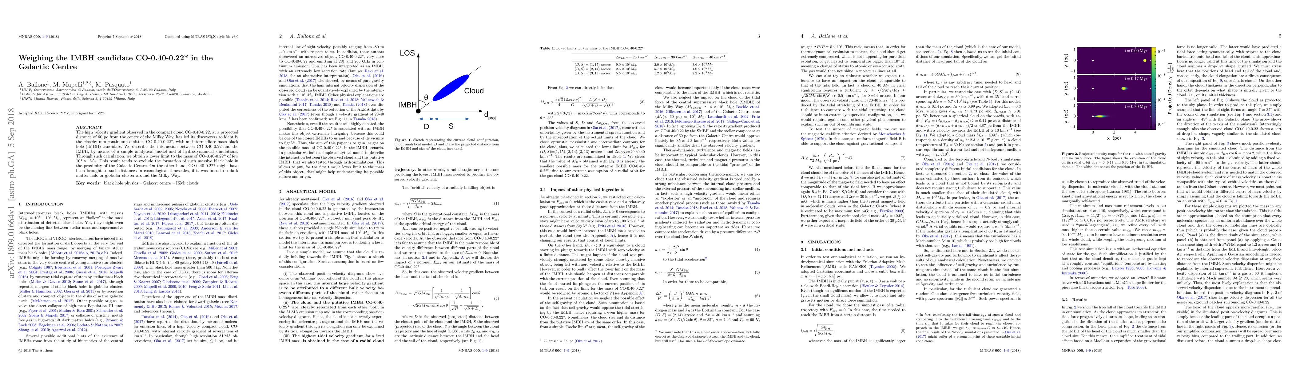 The high velocity gradient observed in the compact cloud CO-0.40-0.22, at a projected distance of 60 pc from the centre of the Milky Way, has led its discoverers to identify the closeby mm continuum emitter, CO-0.40-0.22*, with an intermediate mass black hole (IMBH) candidate. We describe the interaction between CO-0.40-0.22 and the IMBH, by means of a simple analytical model and of hydrodynamical simulations. Through such calculation, we obtain a lower limit to the mass of CO-0.40-0.22* of few $10^4 \times \; M_{\odot}$. This result tends to exclude the formation of such massive black hole in the proximity of the Galactic Centre. On the other hand, CO-0.40-0.22* might have been brought to such distances in cosmological timescales, if it was born in a dark matter halo or globular cluster around the Milky Way.