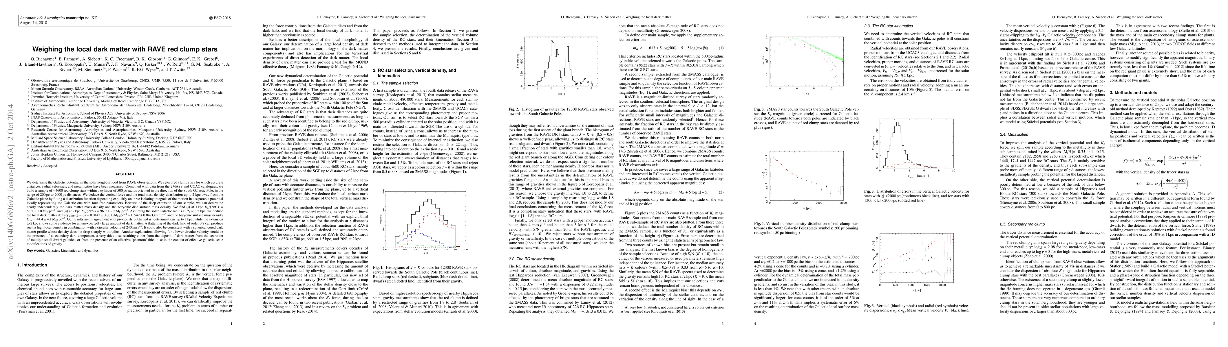 This paper uses RAVE observations of red clump stars to determine the Galactic potential and local dark matter density. The study finds a local dark matter density of 0.542 ± 0.042 GeV/cm³, suggesting an unexpectedly large amount of dark matter at 2 kpc, potentially due to a flattened dark halo or a secondary dark component.
