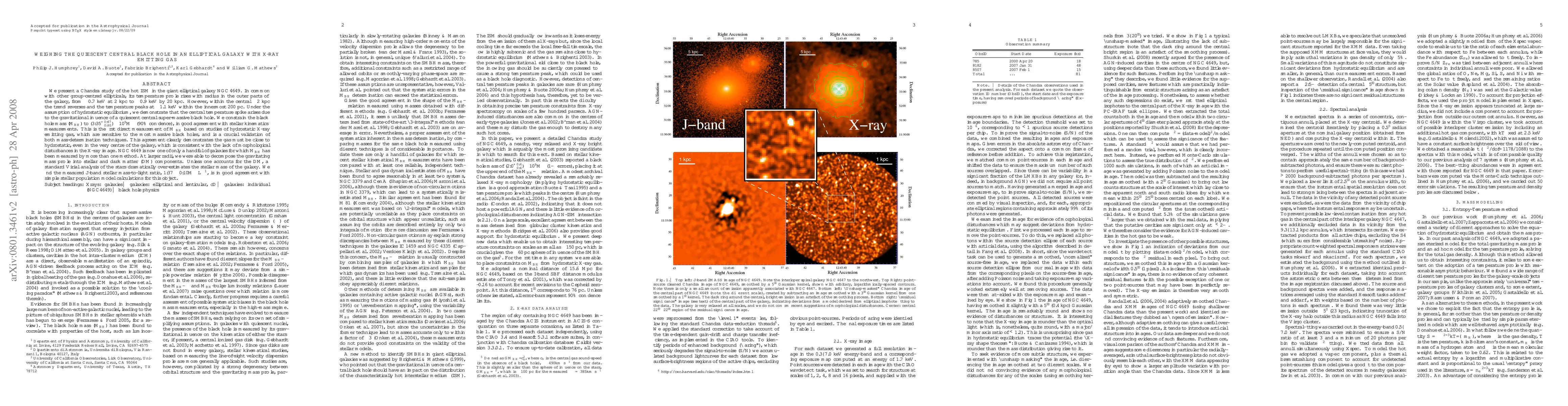 We present a Chandra study of the hot ISM in the giant elliptical galaxy NGC4649. In common with other group-centred ellipticals, its temperature profile rises with radius in the outer parts of the galaxy, from ~0.7keV at 2kpc to ~0.9keV by 20kpc. However, within the central ~2kpc the trend reverses and the temperature peaks at ~1.1keV within the innermost 200pc. Under the assumption of hydrostatic equilibrium, we demonstrate that the central temperature spike arises due to the gravitational influence of a quiescent central super-massive black hole. We constrain the black hole mass (MBH) to $(3.35^{+0.67}_{-0.95})\times 10^9$Msun (90% confidence), in good agreement with stellar kinematics measurements. This is the first direct measurement of MBH based on studies of hydrostatic X-ray emitting gas, which are sensitive to the most massive black holes, and is a crucial validation of both mass-determination techniques. This agreement clearly demonstrates the gas must be close to hydrostatic, even in the very centre of the galaxy, which is consistent with the lack of morphological disturbances in the X-ray image. NGC4649 is now one of only a handful of galaxies for which MBH has been measured by more than one method. At larger radii, we were able to decompose the gravitating mass profile into stellar and dark matter (DM) components. Unless one accounts for the DM, a standard Virial analysis of the stars dramatically over-estimates the stellar mass of the galaxy. We find the measured J-band stellar mass-to-light ratio, 1.37+/-0.10 Msun/Lsun, is in good agreement with simple stellar population model calculations for this object.