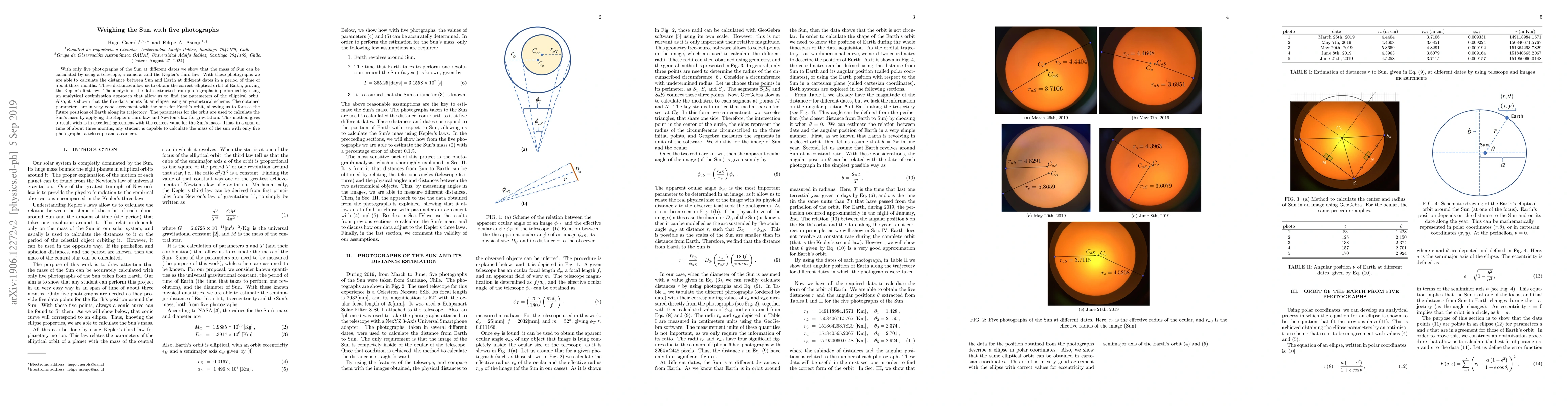 Researchers used 5 photographs of the Sun to calculate its mass using a telescope, camera, and Kepler's third law, achieving results in excellent agreement with established values.