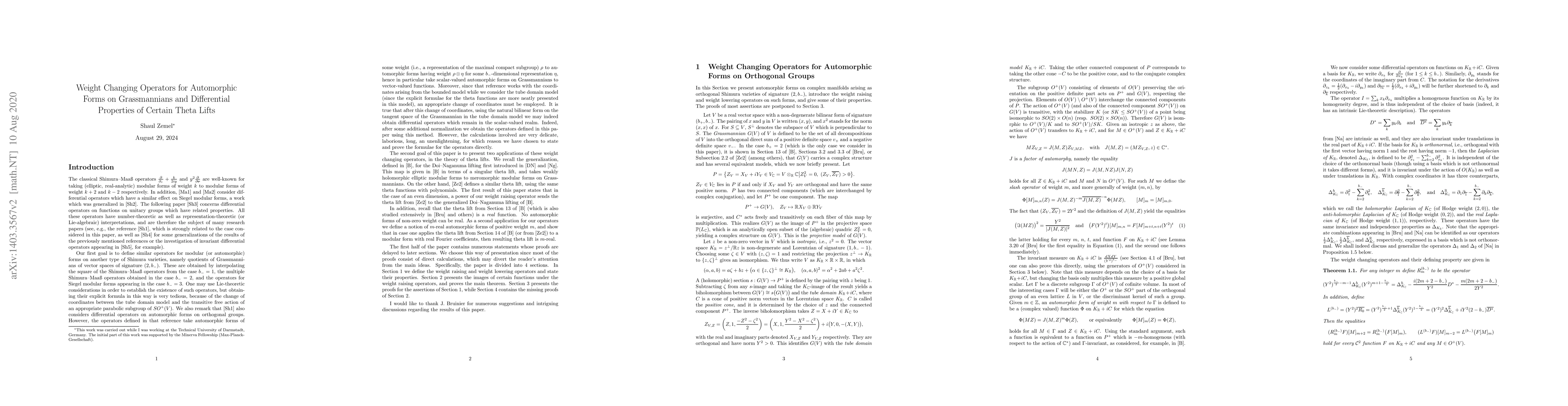 This paper defines weight changing operators for automorphic forms on Grassmannians and explores their properties. It further examines theta lifts of modular forms, revealing intriguing differential properties when theta kernels involve specific polynomial types.