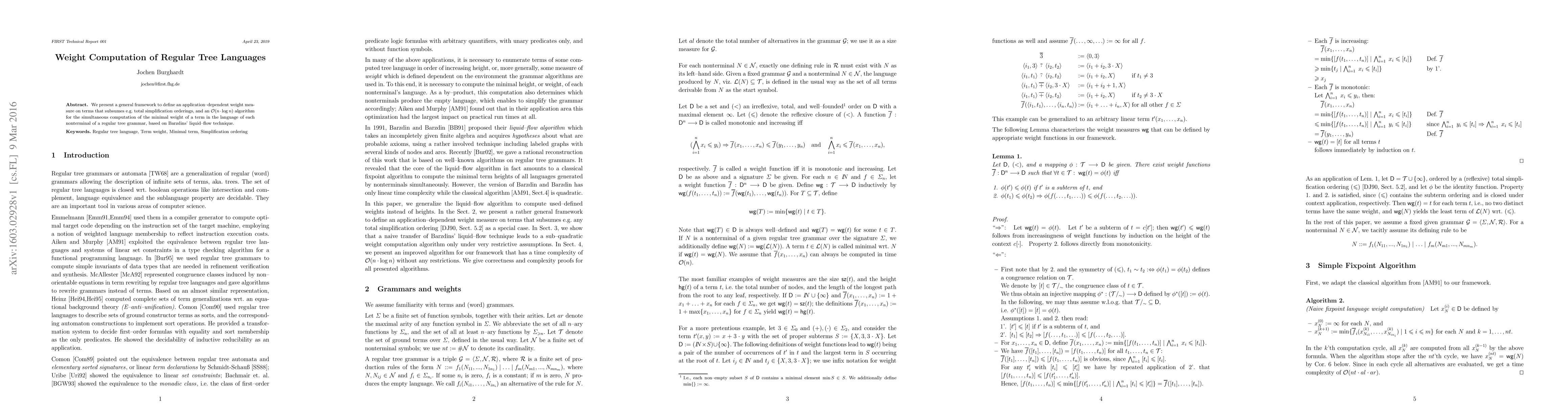 We present a general framework to define an application-dependent weight measure on terms that subsumes e.g. total simplification orderings, and an O(n log n) algorithm for the simultaneous computation of the minimal weight of a term in the language of each nonterminal of a regular tree grammar, based on Barzdins' liquid-flow technique.
