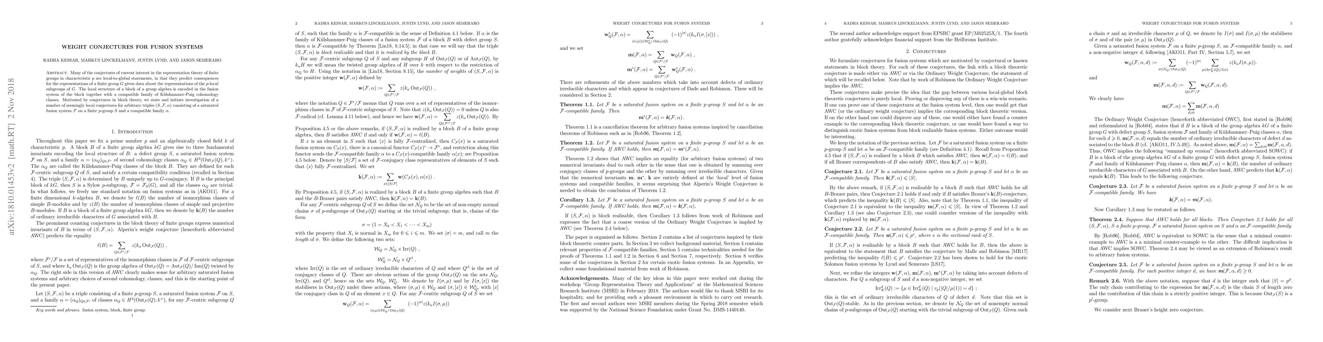 Researchers investigate local conjectures for fusion systems, a representation theory concept in finite groups, aiming to understand consequences of subgroups' representations on the whole group.
