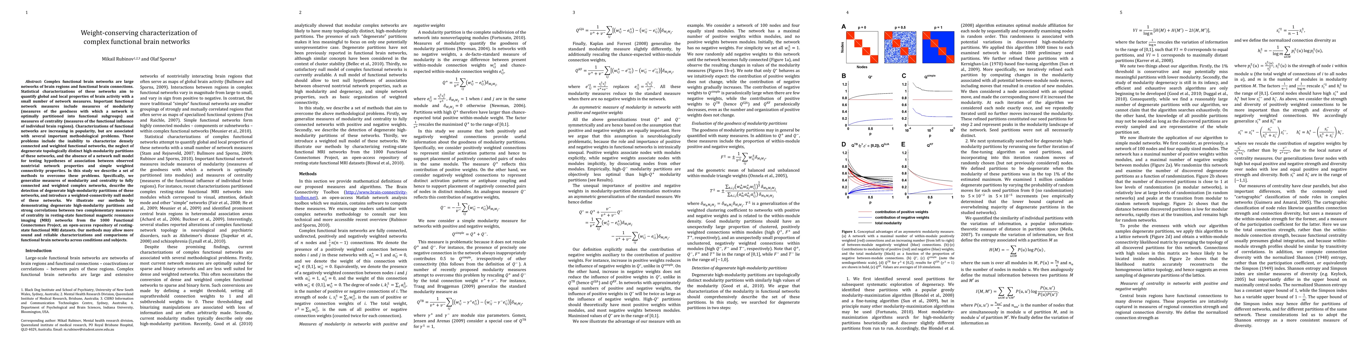 Complex functional brain networks are large networks of brain regions and functional brain connections. Statistical characterizations of these networks aim to quantify global and local properties of brain activity with a small number of network measures. Important functional network measures include measures of modularity (measures of the goodness with which a network is optimally partitioned into functional subgroups) and measures of centrality (measures of the functional influence of individual brain regions). Characterizations of functional networks are increasing in popularity, but are associated with several important methodological problems. These problems include the inability to characterize densely connected and weighted functional networks, the neglect of degenerate topologically distinct high-modularity partitions of these networks, and the absence of a network null model for testing hypotheses of association between observed nontrivial network properties and simple weighted connectivity properties. In this study we describe a set of methods to overcome these problems. Specifically, we generalize measures of modularity and centrality to fully connected and weighted complex networks, describe the detection of degenerate high-modularity partitions of these networks, and introduce a weighted-connectivity null model of these networks. We illustrate our methods by demonstrating degenerate high-modularity partitions and strong correlations between two complementary measures of centrality in resting-state functional magnetic resonance imaging (MRI) networks from the 1000 Functional Connectomes Project, an open-access repository of resting-state functional MRI datasets. Our methods may allow more sound and reliable characterizations and comparisons of functional brain networks across conditions and subjects.